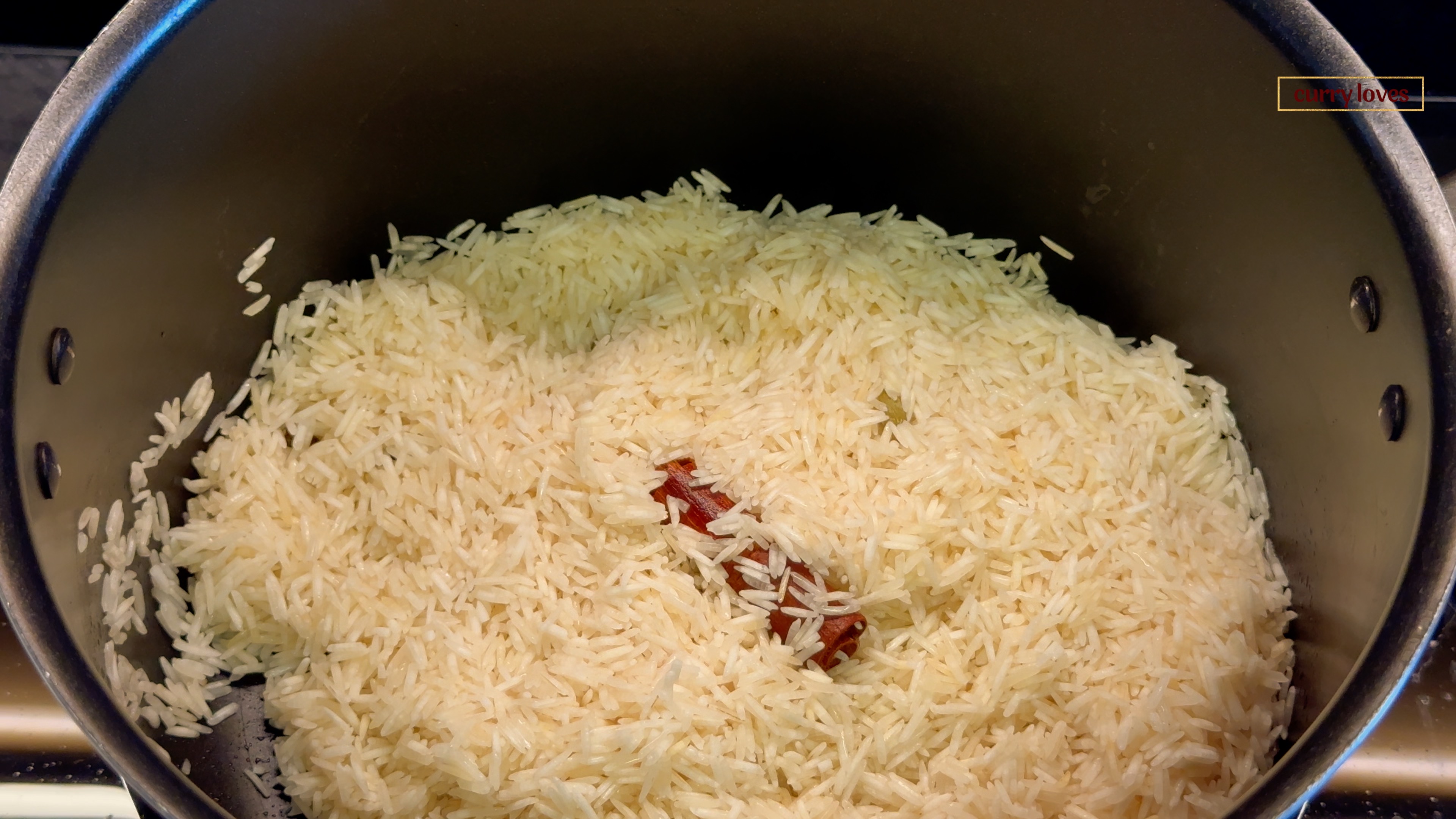 - For the rice, heat 1 tbsp ghee in a clean pot. Add cinnamon, cloves, and cardamom. Once aromatic, add soaked basmati rice and gently mix.