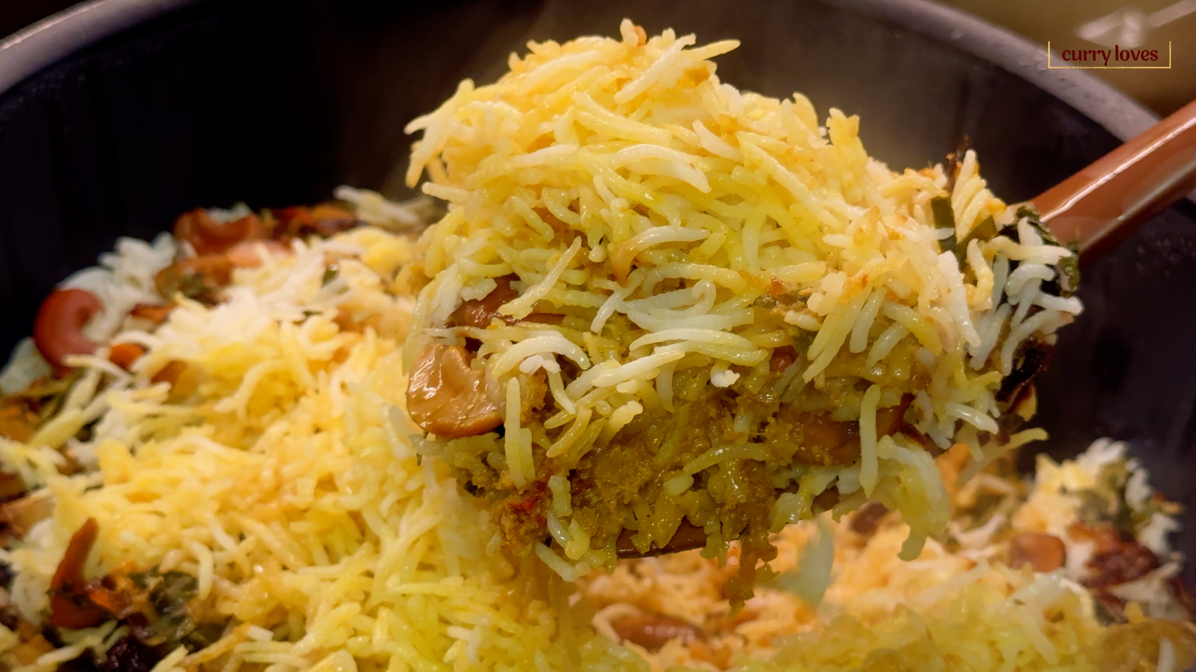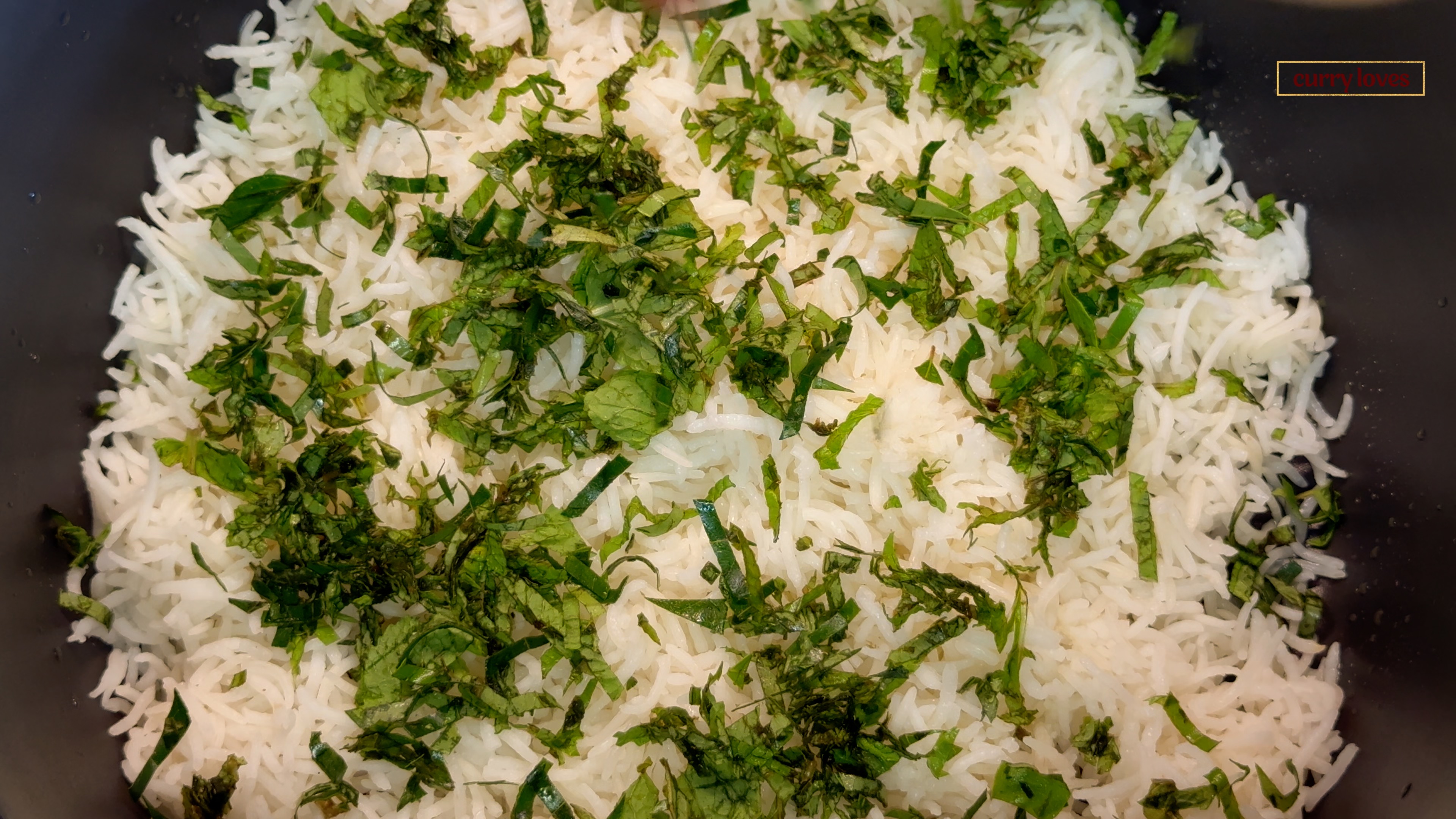 - Layer half of the cooked rice, followed by chopped mint and curry leaves.