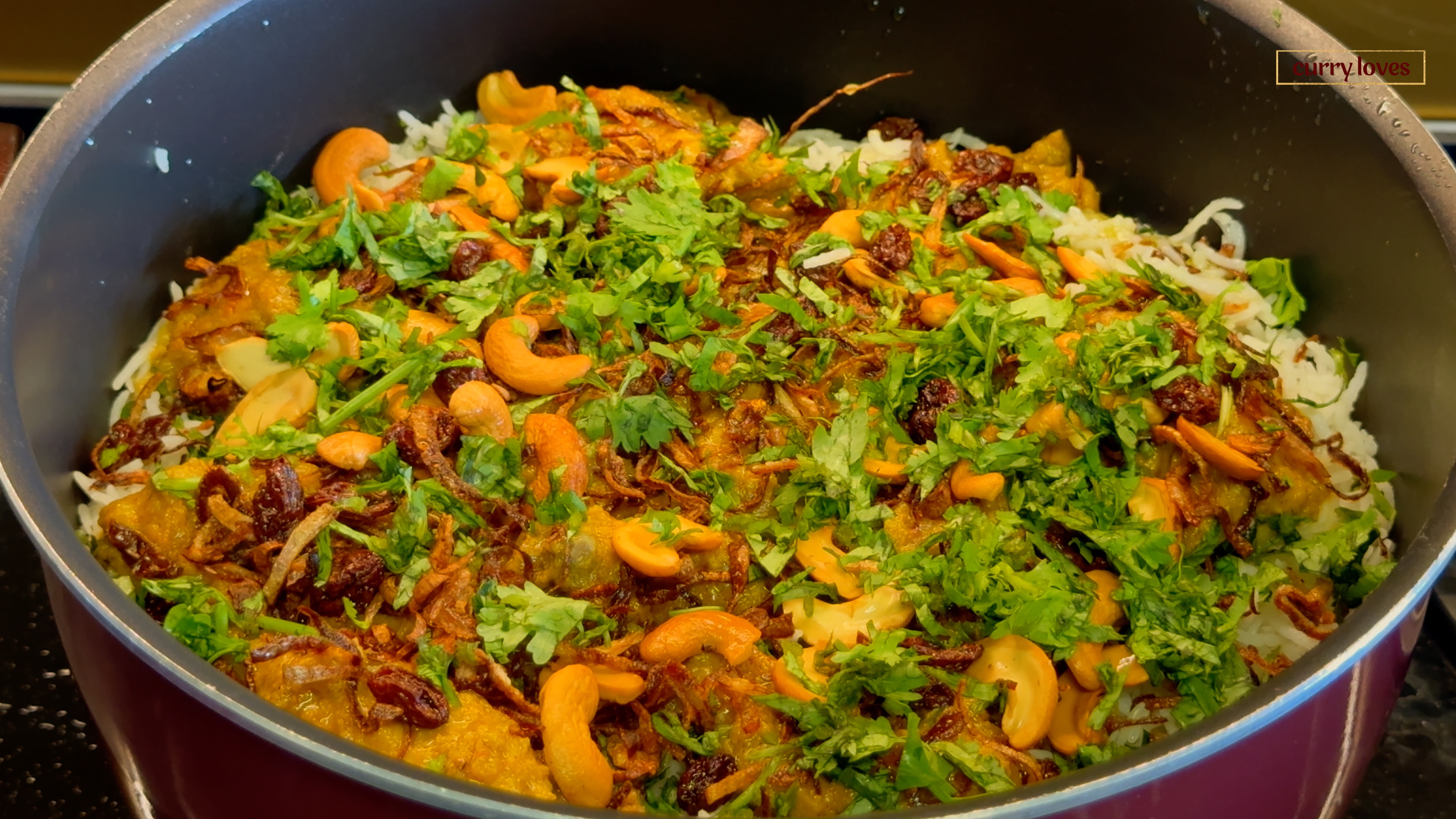 - Top with fried onions, raisins, cashew nuts, and chopped coriander leaves.