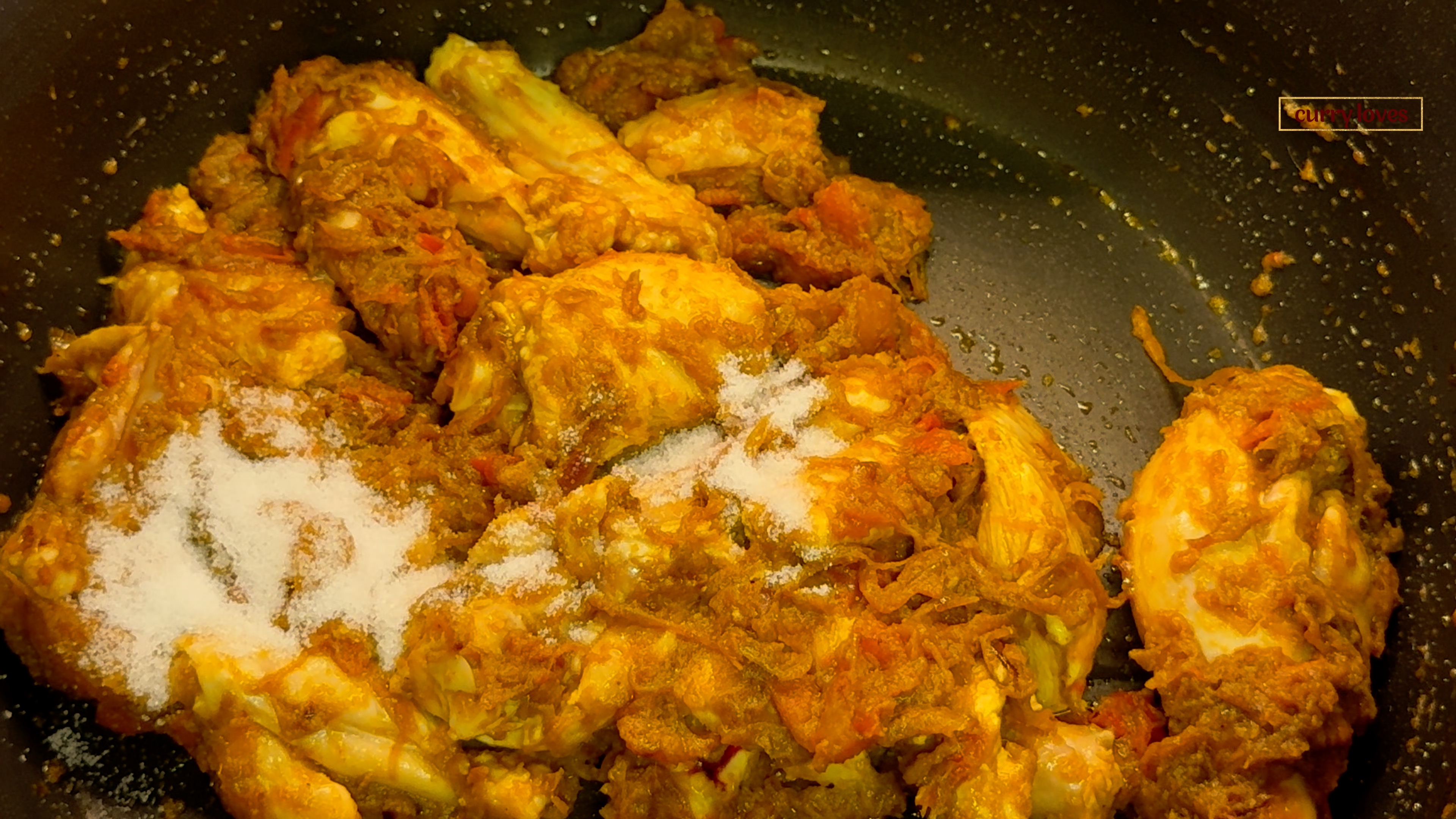 - Add chicken and sauté on high flame for 5 minutes. Add salt and mix well.