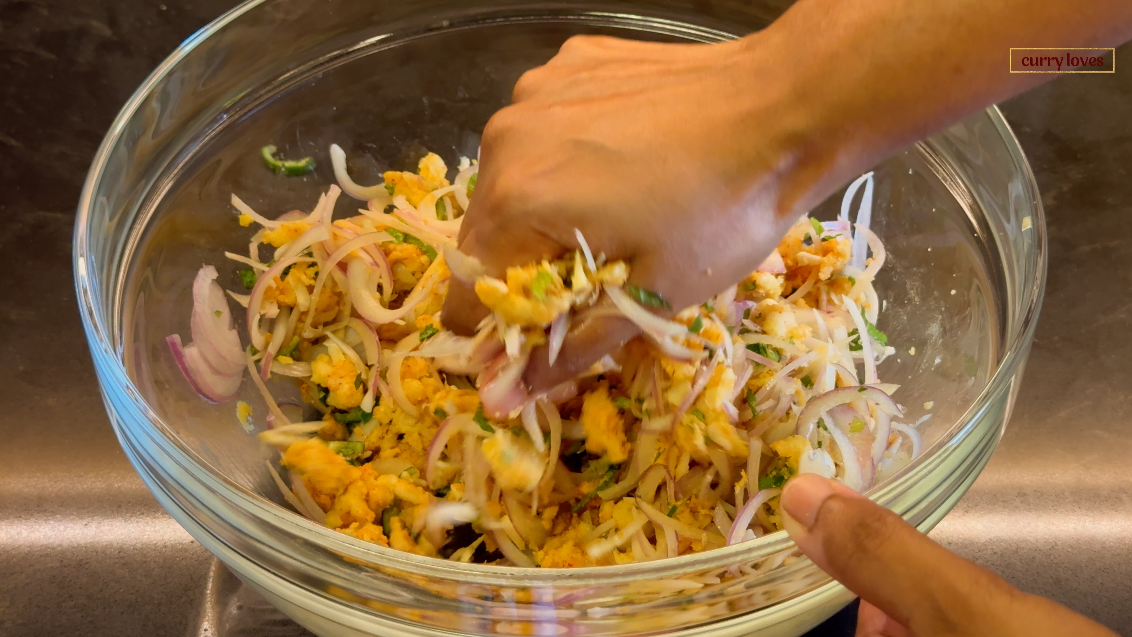Incorporate the sliced onions, cashew nuts, mint leaves, and green chillies. Mix well.