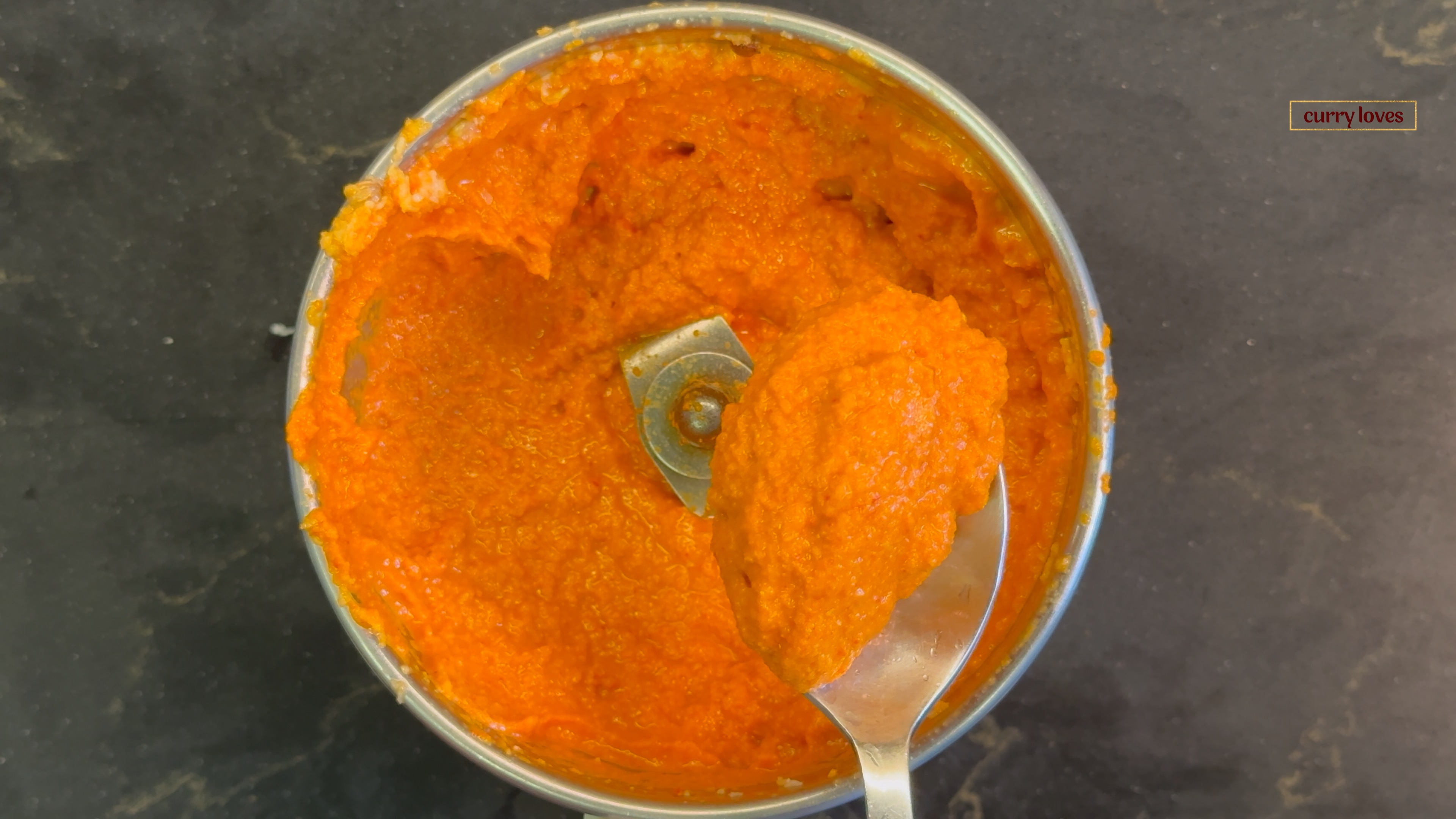 In a mixer jar, add the soaked red chilies, grated coconut, and coriander seeds. Grind coarsely, then add a little water and grind to a smooth paste. Set aside.