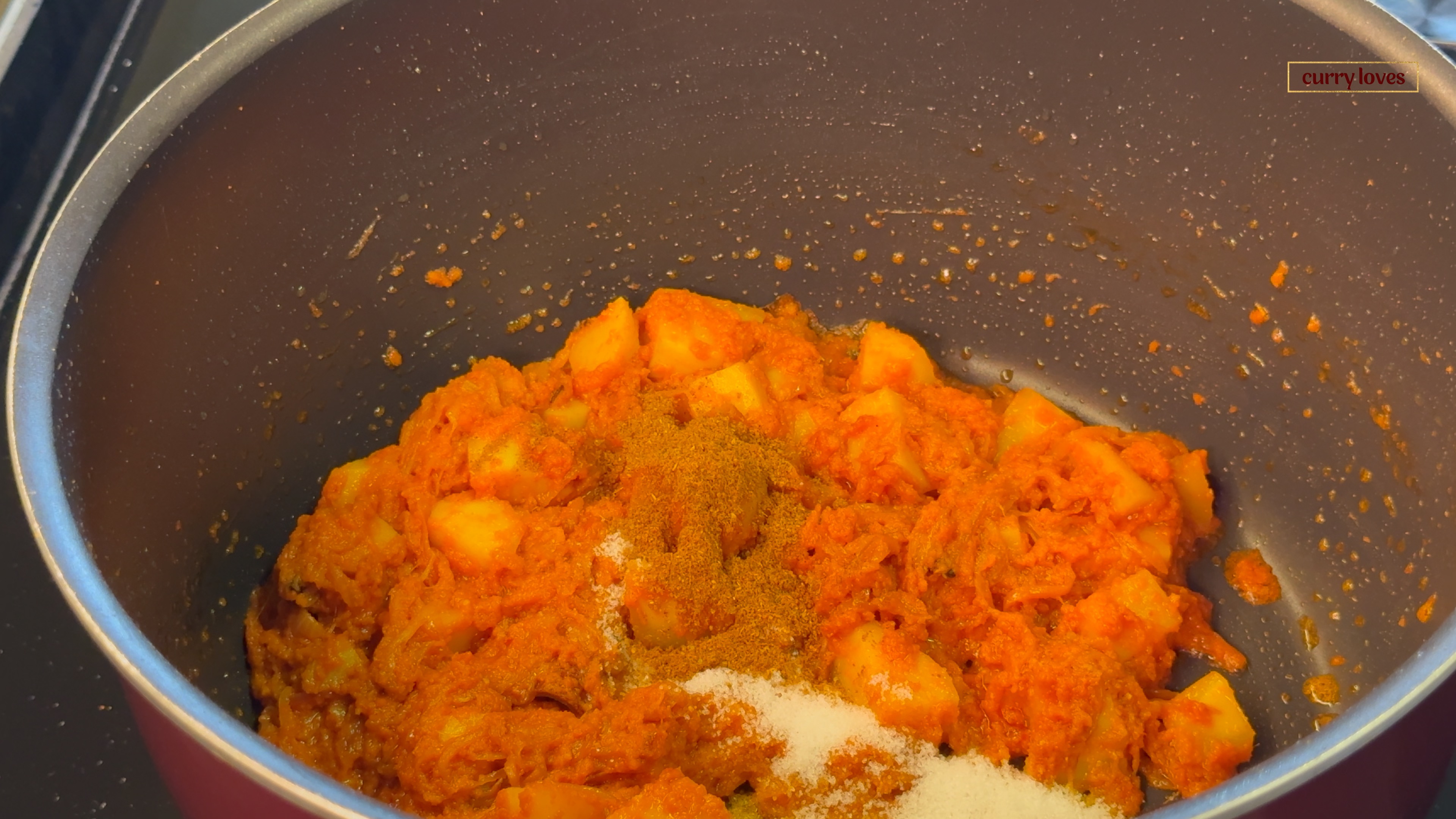 Add the chili-coconut paste and sauté on low flame for 7-8 minutes until the oil separates from the mixture.