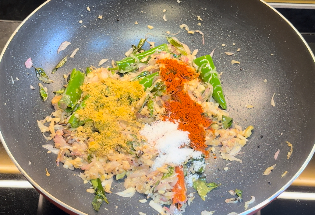 Sauté the Ingredients: In a pan, heat 2 tsp of oil. Add fennel seeds, coriander seeds, grated coconut, and dried red chilies. Sauté until the coconut turns a light golden brown.