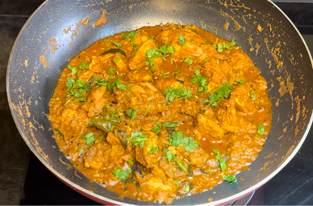 Chicken masala Kerala style is a delightful traditional Indian dish from Kerala, a state in South India. The authentic flavors come alive with ingredients like coconut milk, fresh grated coconut, coconut oil, and curry leaves. The dish is cooked with aromatic spices such as cinnamon, cardamom, cloves, star anise, mustard seeds and curry leaves. Chicken pieces are then simmered in a flavorful onion and tomato base with a spicy grated coconut paste, enhanced by a variety of spices like chili powder, coriander powder, and garam masala. This semi-dry dish offers a distinctive and authentic taste that truly stands out and is sure to please!