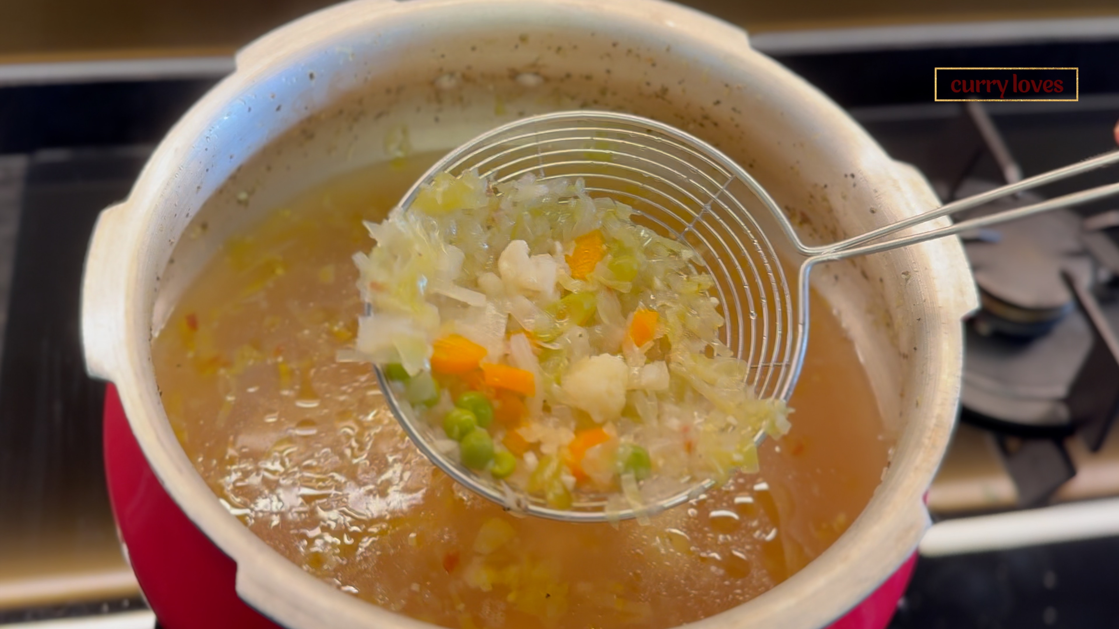 Once the pressure releases naturally, remove the weight and open the lid. Strain the cooked vegetables using a fine mesh sieve, keeping the vegetable stock aside for later use.