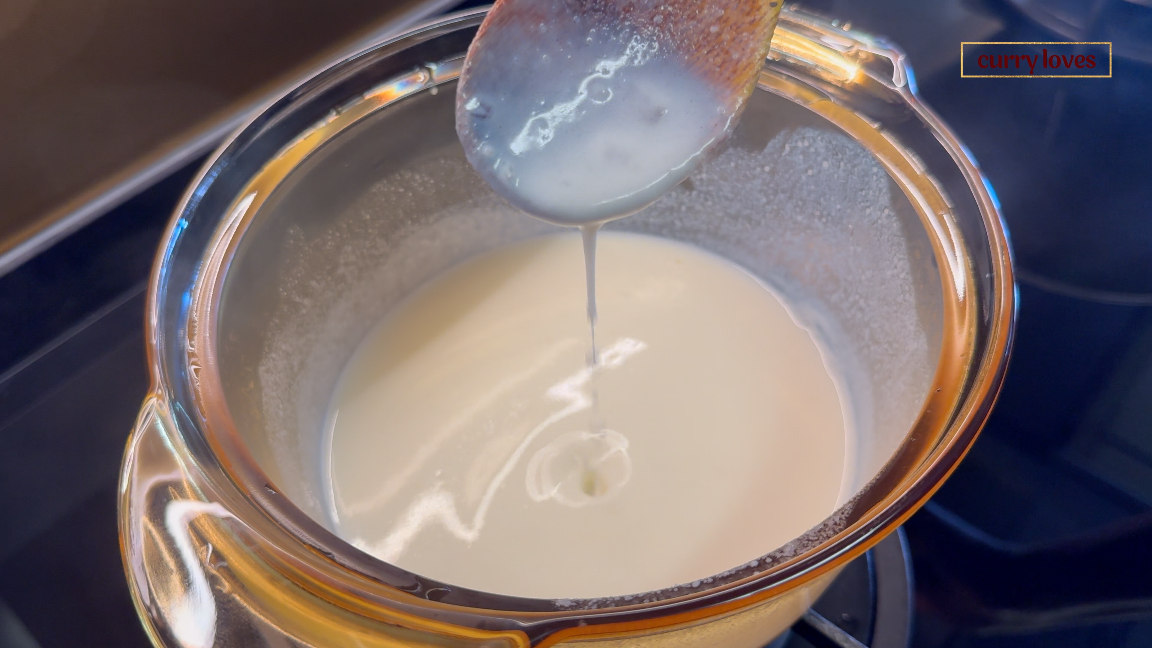 Add the prepared slurry to the pot and continue stirring until no lumps remain.