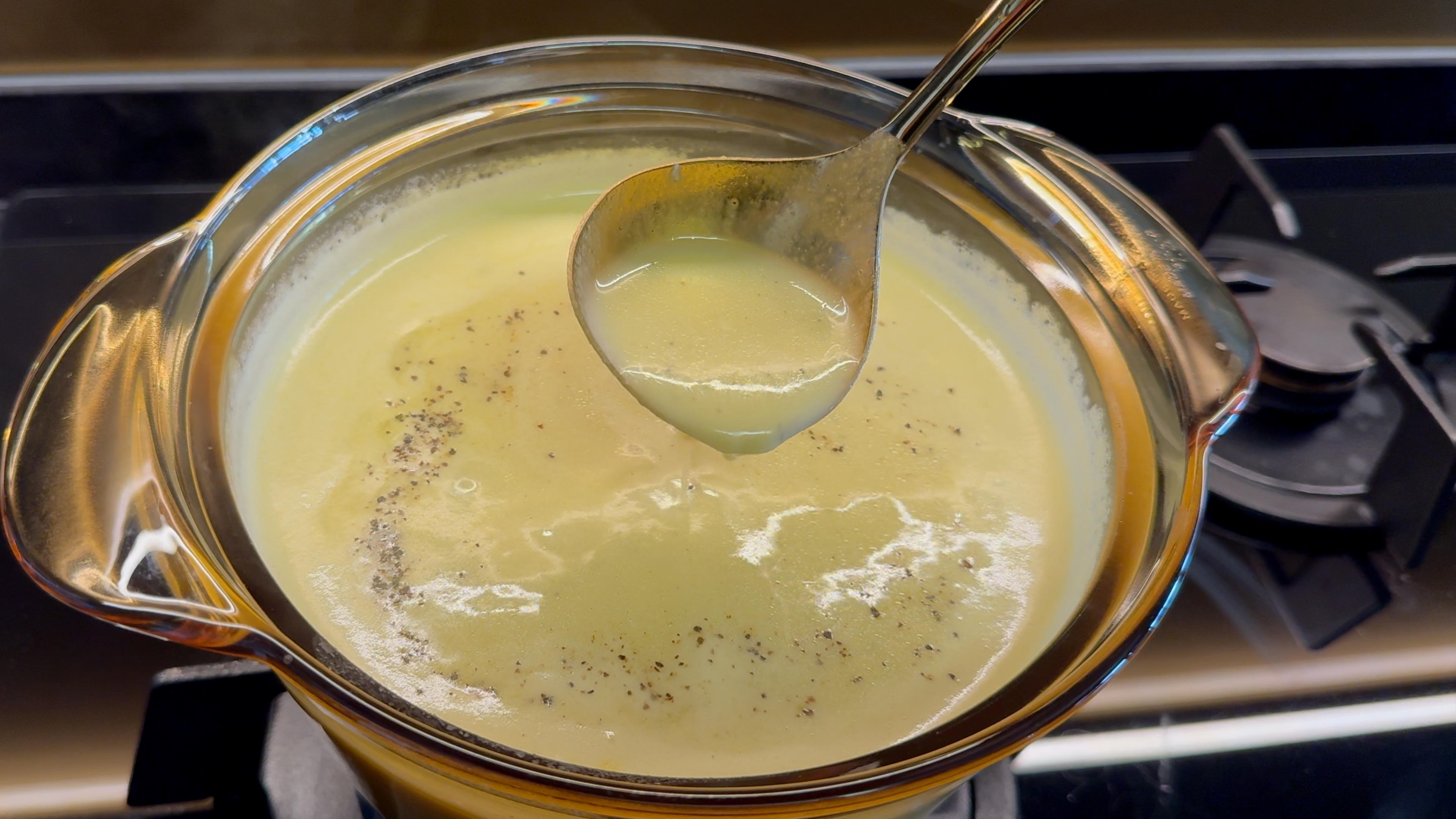 Gradually warm 1 cup of milk and pour it into the pot, whisking continuously to ensure a creamy, lump-free consistency.