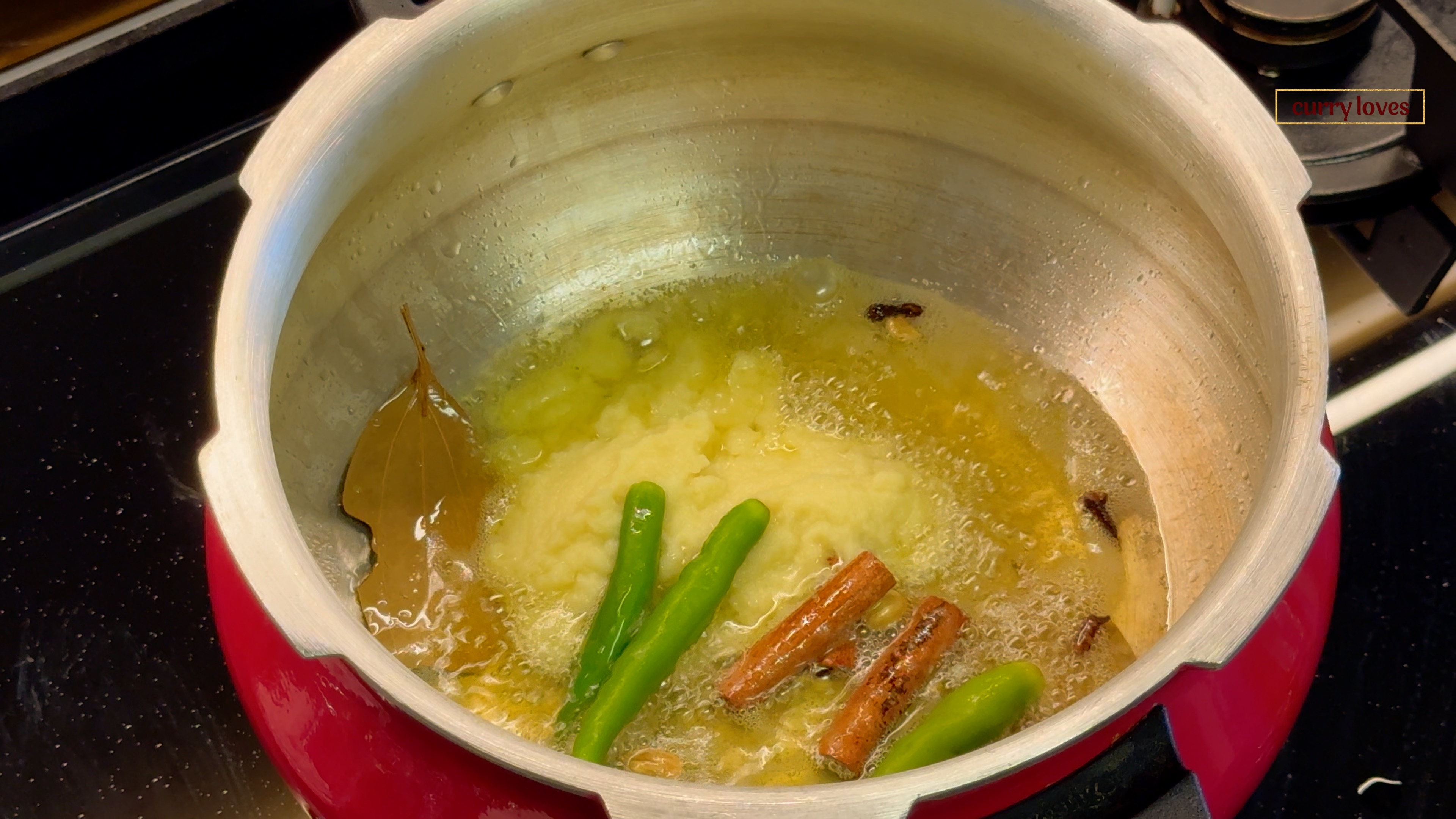 In a large pressure cooker, heat 150 ml of oil and 50 ml of ghee over medium heat. Add the cardamom, cinnamon, bay leaves, and cloves. Sauté for a few seconds until fragrant. Add the remaining ginger garlic paste and the green chilies. Sauté on low flame for 3-4 minutes. Stir in the onion-shallot paste and cook on low flame for 5 minutes. -