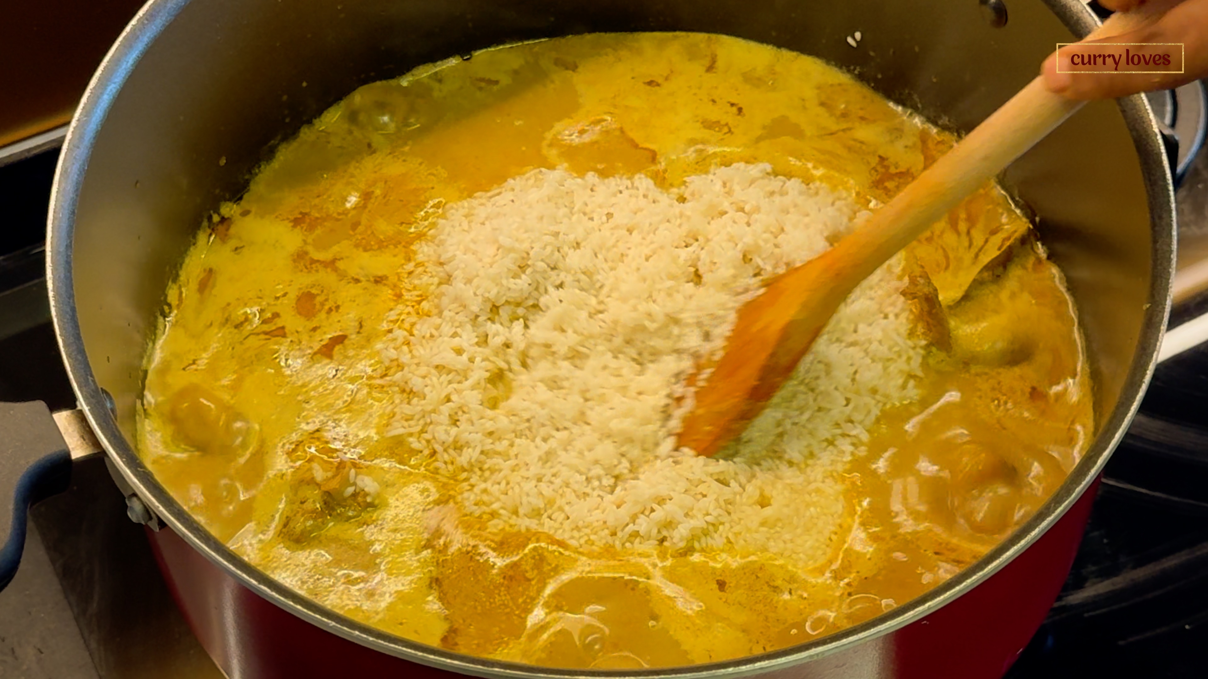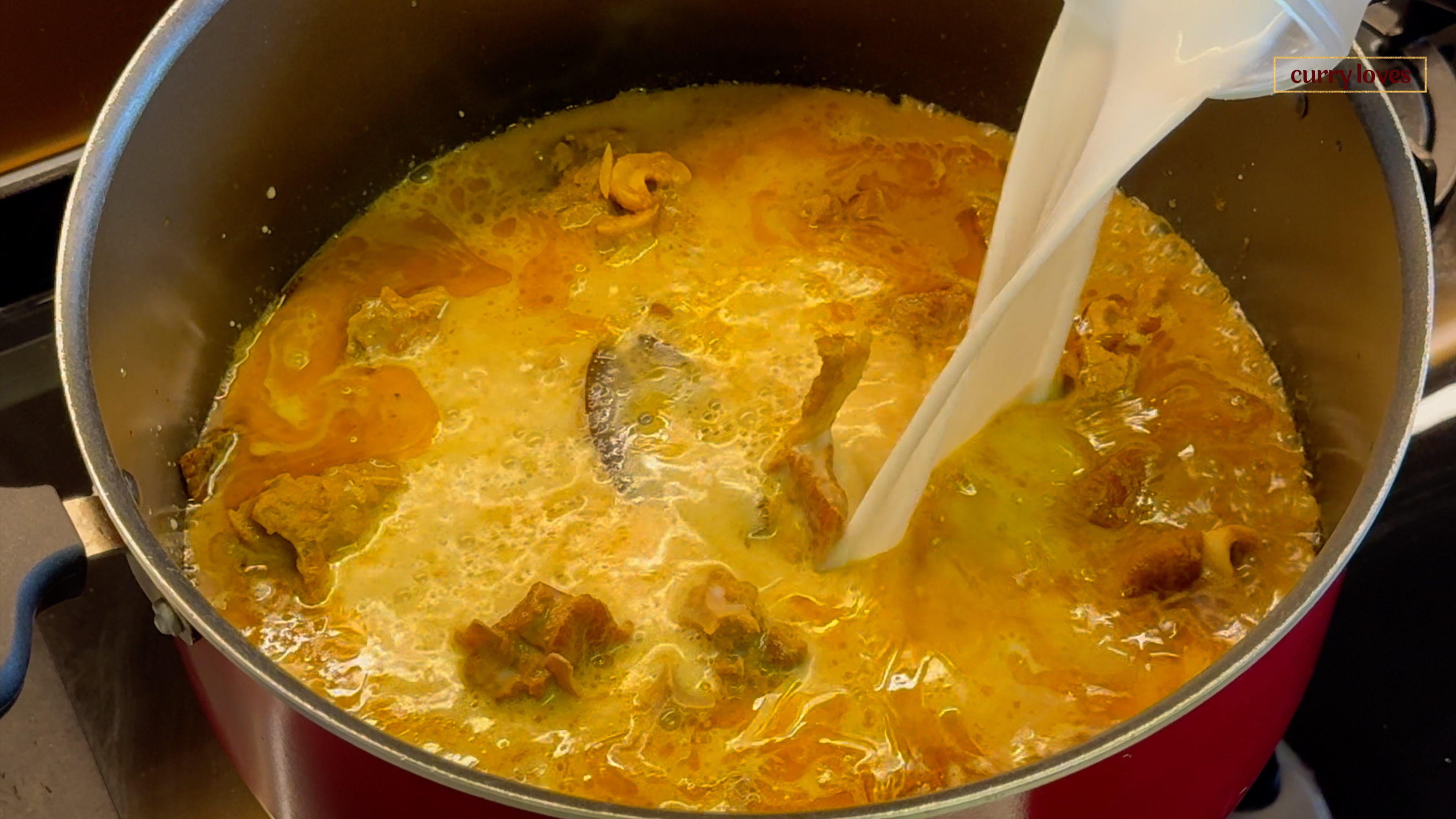 Once the pressure releases naturally, open the cooker. Check the doneness of the mutton and transfer the mixture to a large biryani pot. Cook for 3 minutes on medium flame, then add 4 cups of thick and diluted coconut milk. Adjust the salt if needed. -