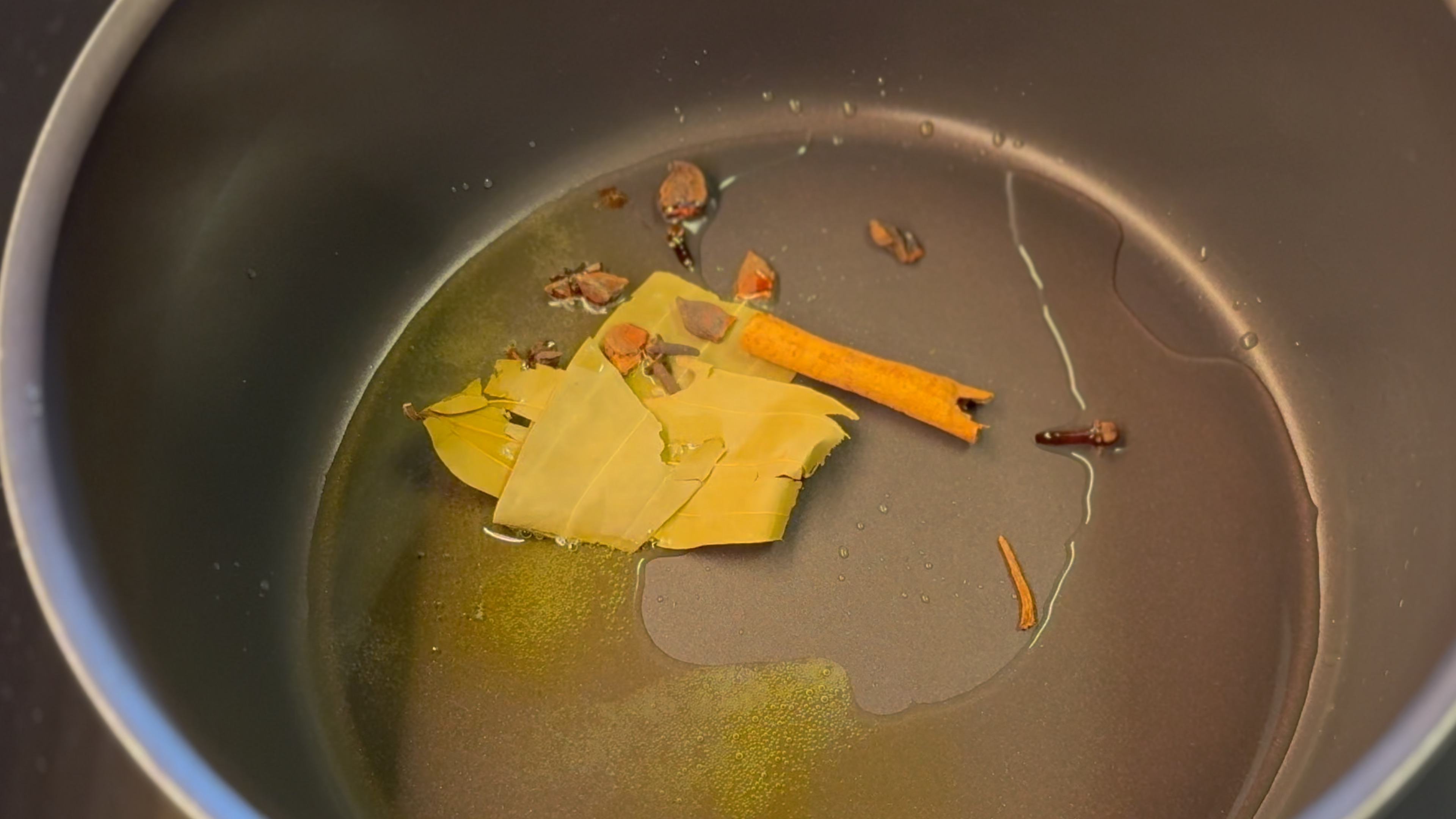 In a pot, add 4 tbsp oil and 2 tbsp ghee. Once hot, add 2 bay leaves, 1 cinnamon stick, 5 cloves, and 2 star anise. Fry until aromatic.