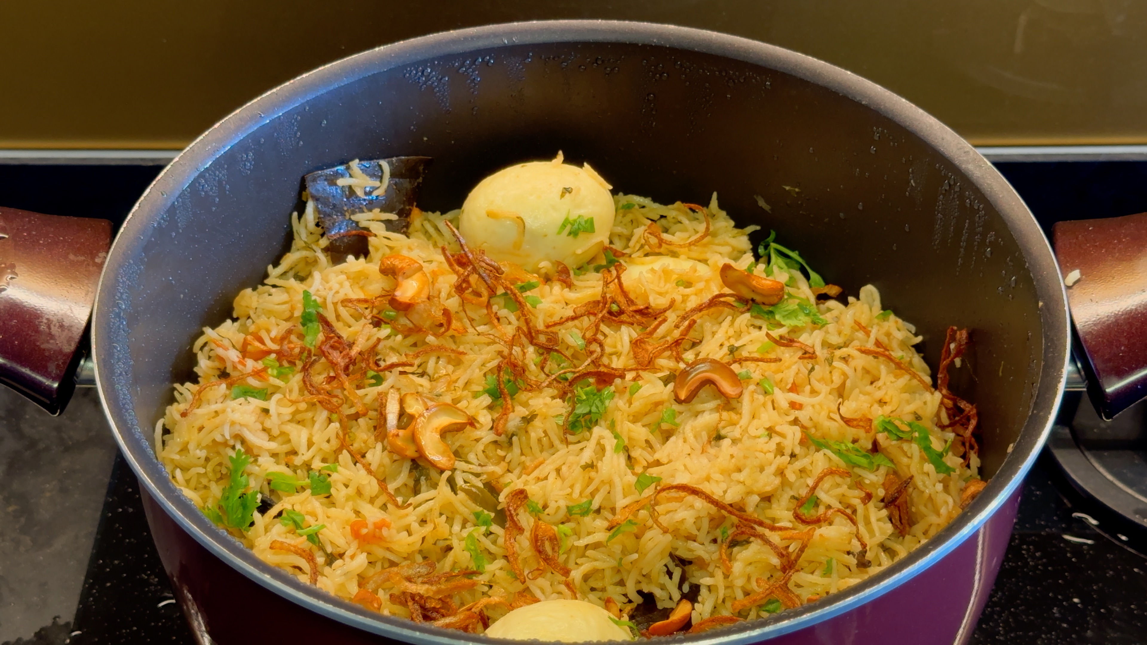 This egg biryani recipe is a delicious and aromatic dish that combines the rich flavors of spices with basmati rice and boiled eggs. The masala, with chili powder, coriander, and garam masala, is cooked just right with yogurt, coating each grain of rice in its bold taste. After adding the eggs, the biryani is gently cooked to let all the flavors blend together. It's topped off with a simple garnish of coriander, fried onions, and cashews, making it a comforting, flavorful meal for anyone to enjoy.