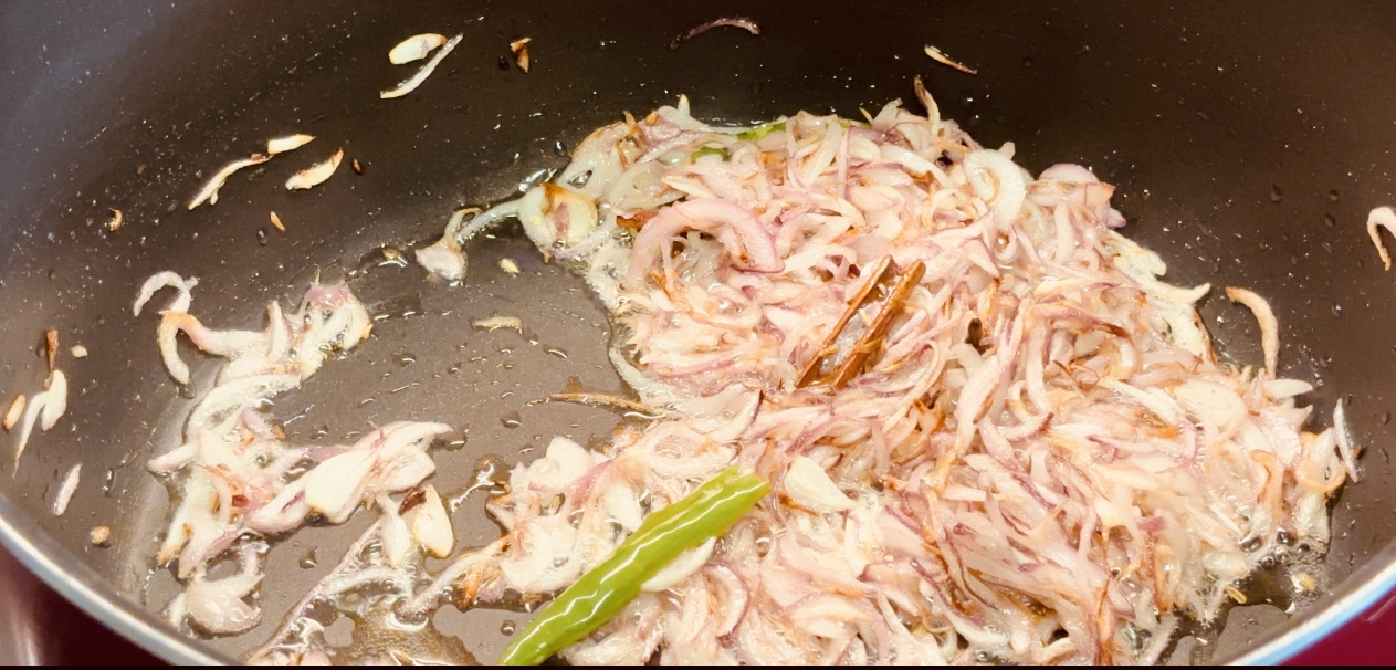 Add sliced onions and green chillies, and fry until golden brown on medium flame.