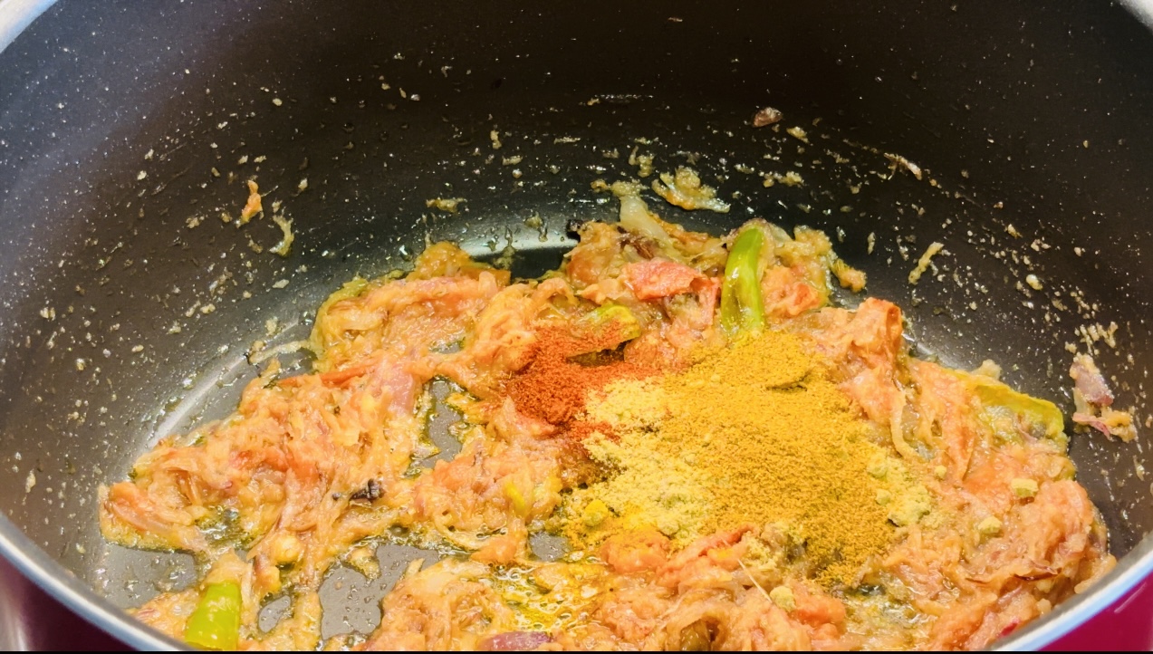 Add chilli powder, turmeric powder, coriander powder, garam masala, and salt. Sauté for 10 minutes on low flame or until oil separates.