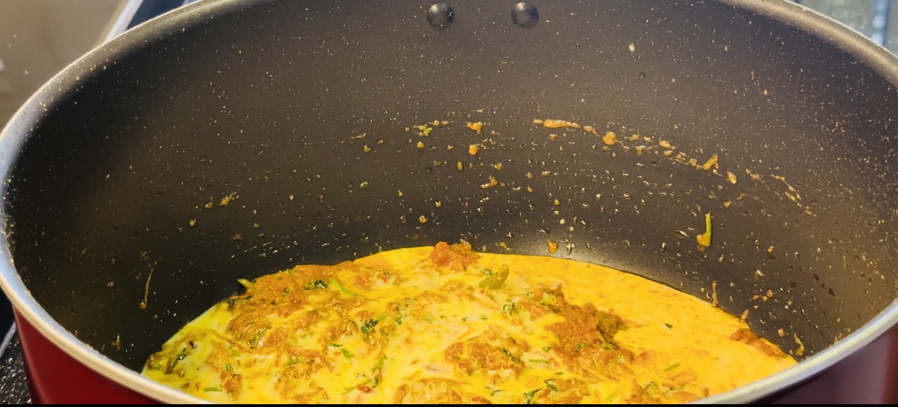 Turn to high flame, add chopped coriander leaves, and cook for 5-7 minutes until the curd is well absorbed with the masala.