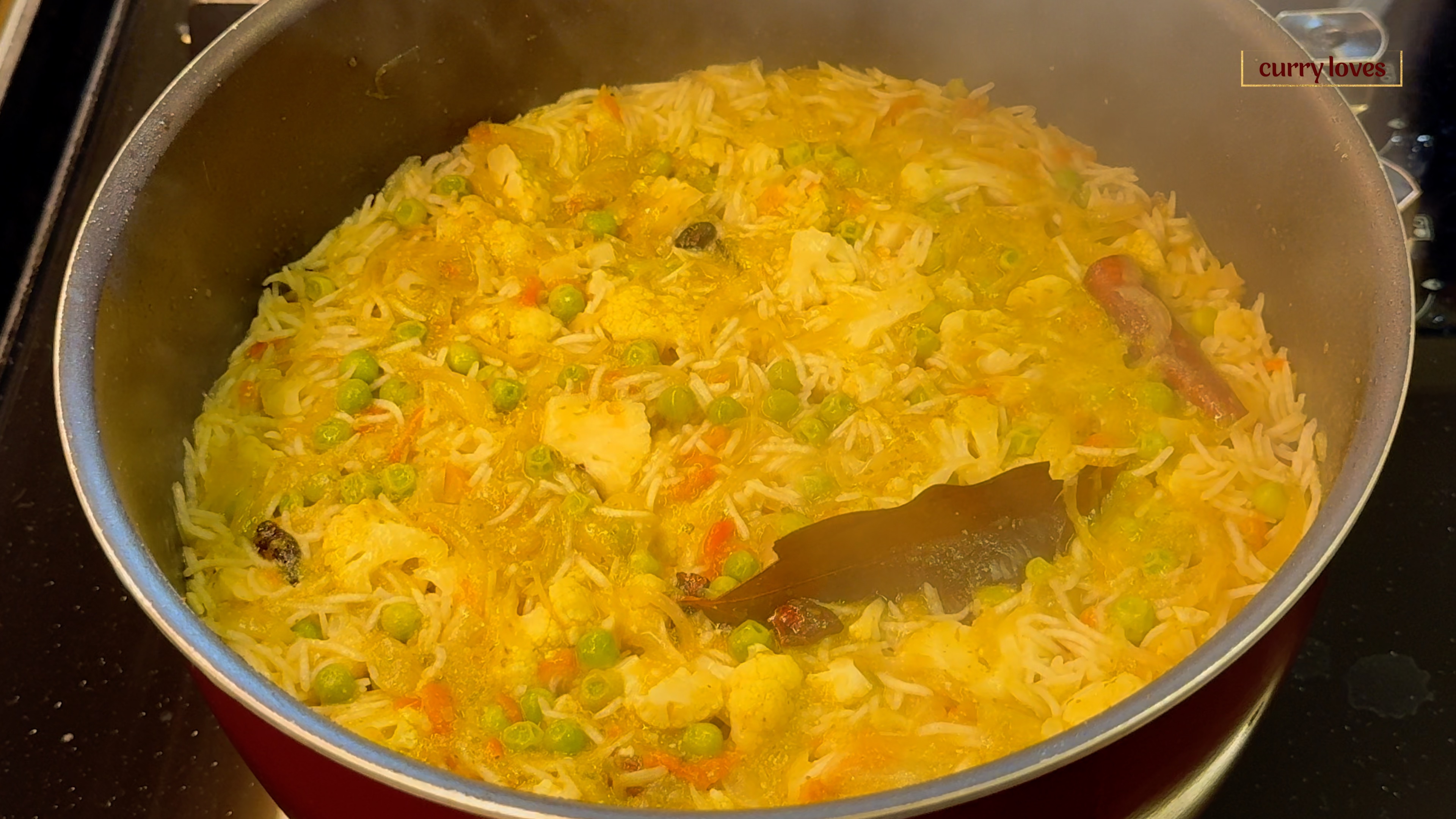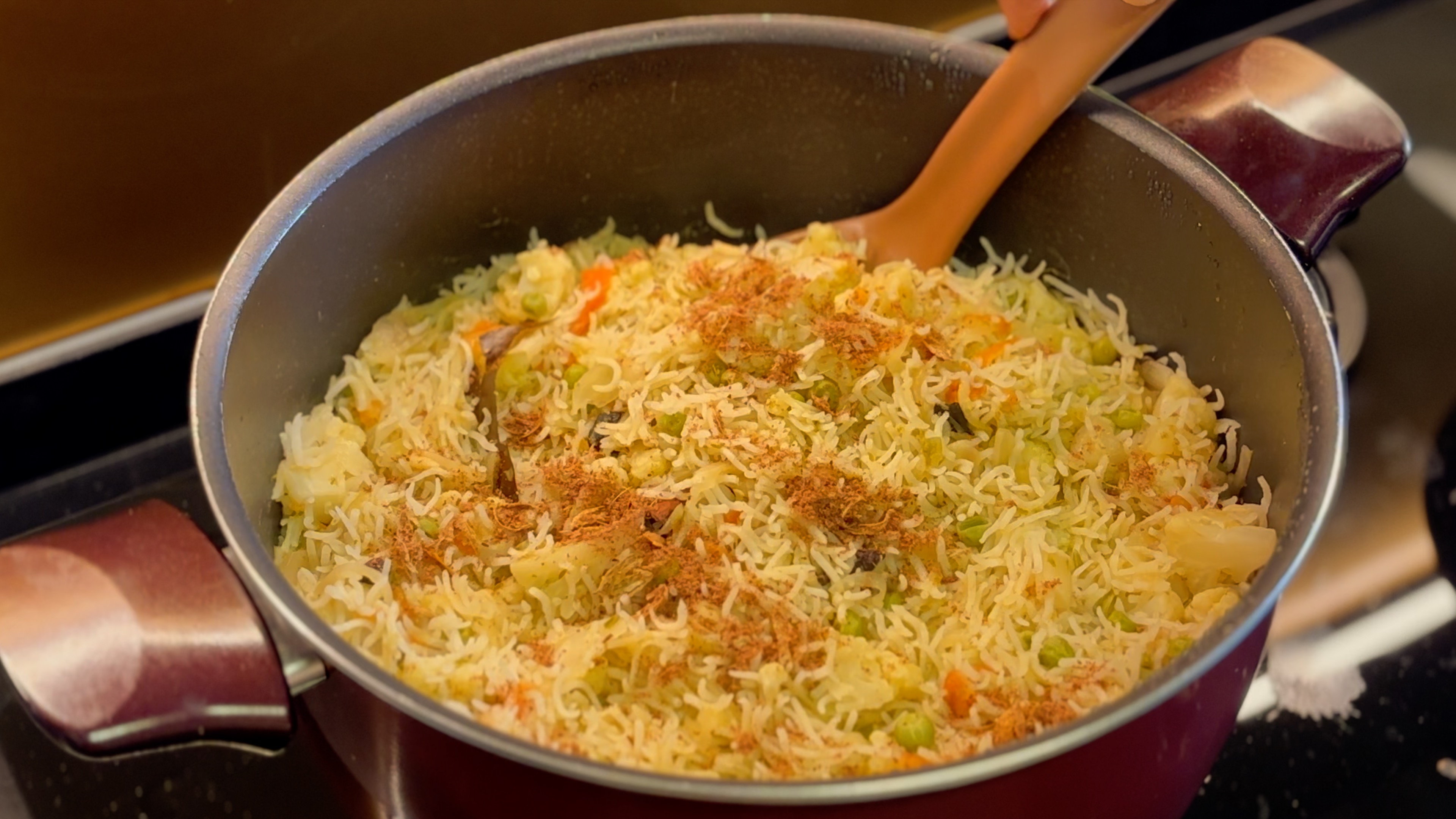 Add the roasted basmati rice. Mix, cover, and cook on low flame for 8 mins.