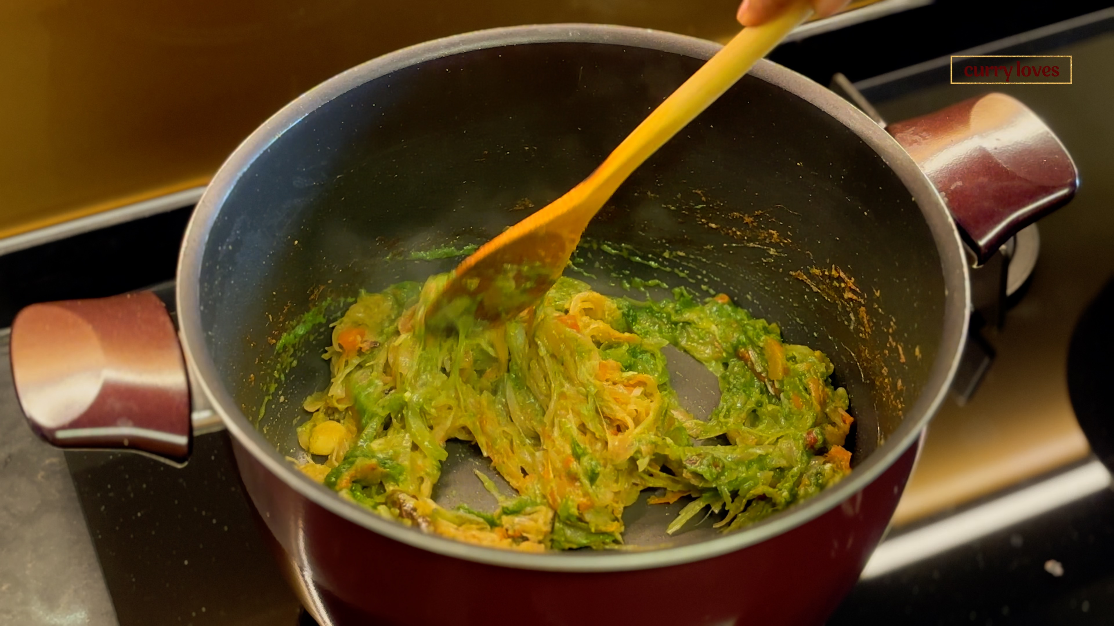 Add the ground shallots and green chilli paste. Sauté on low flame for 2-3 mins.