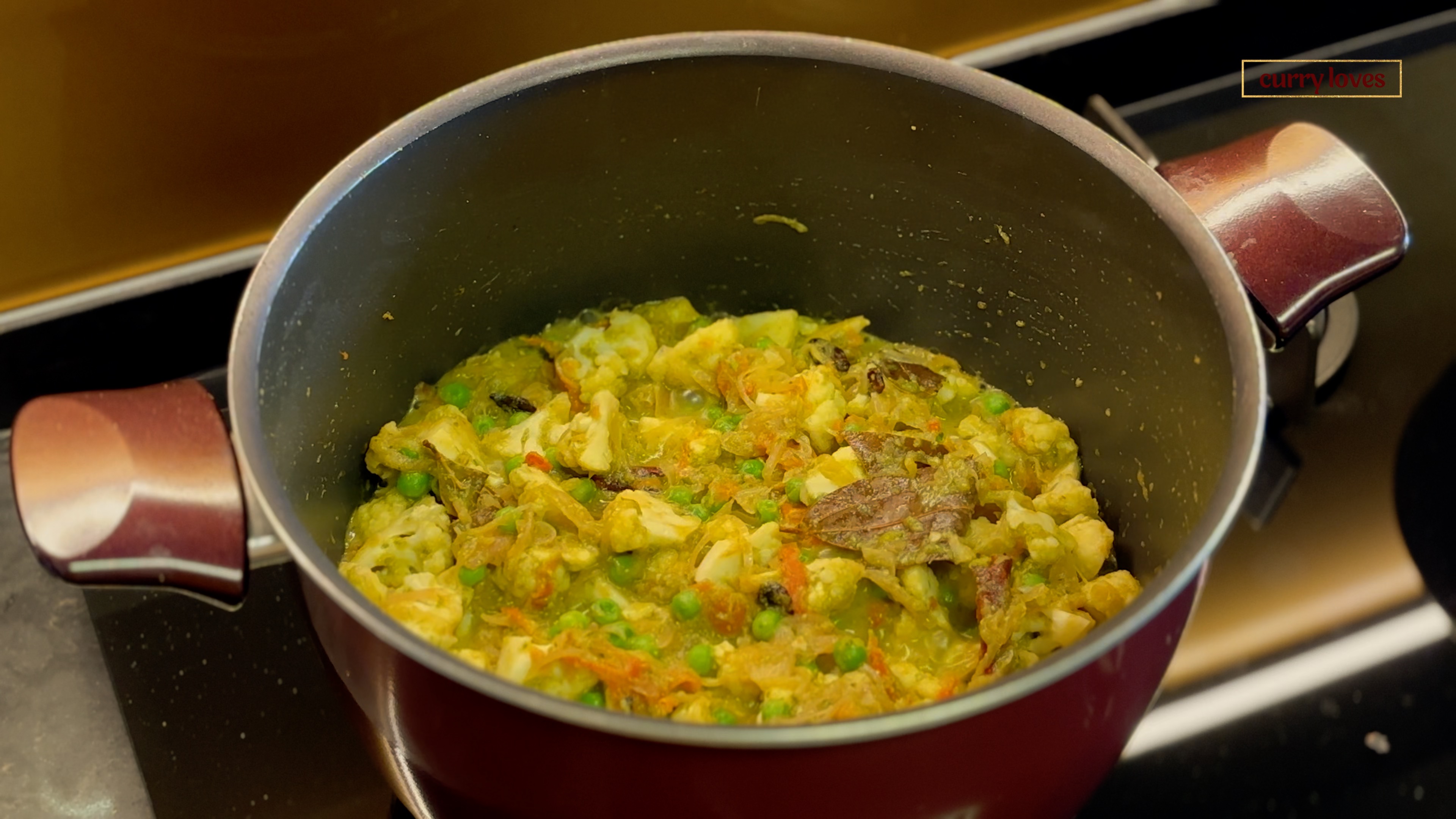 After adding the basmati rice to the pan, carefully stir to coat the grains with the flavorful masala mixture. Cook the rice for about 8 minutes over low heat, allowing it to absorb the flavors and begin cooking. At the end of this initial cooking time, gently stir the pulao again to ensure even distribution of the masalas. Infuse every grain of rice with the spices for the best taste. After stirring, cover the pan and continue cooking for another 15 minutes on low heat. Resist the temptation to open the Gobi Matar Pulao immediately. Let the finished dish rest for at least 15 minutes. This will ensure the rice is fully cooked, fluffy, and aromatic, ready to serve.