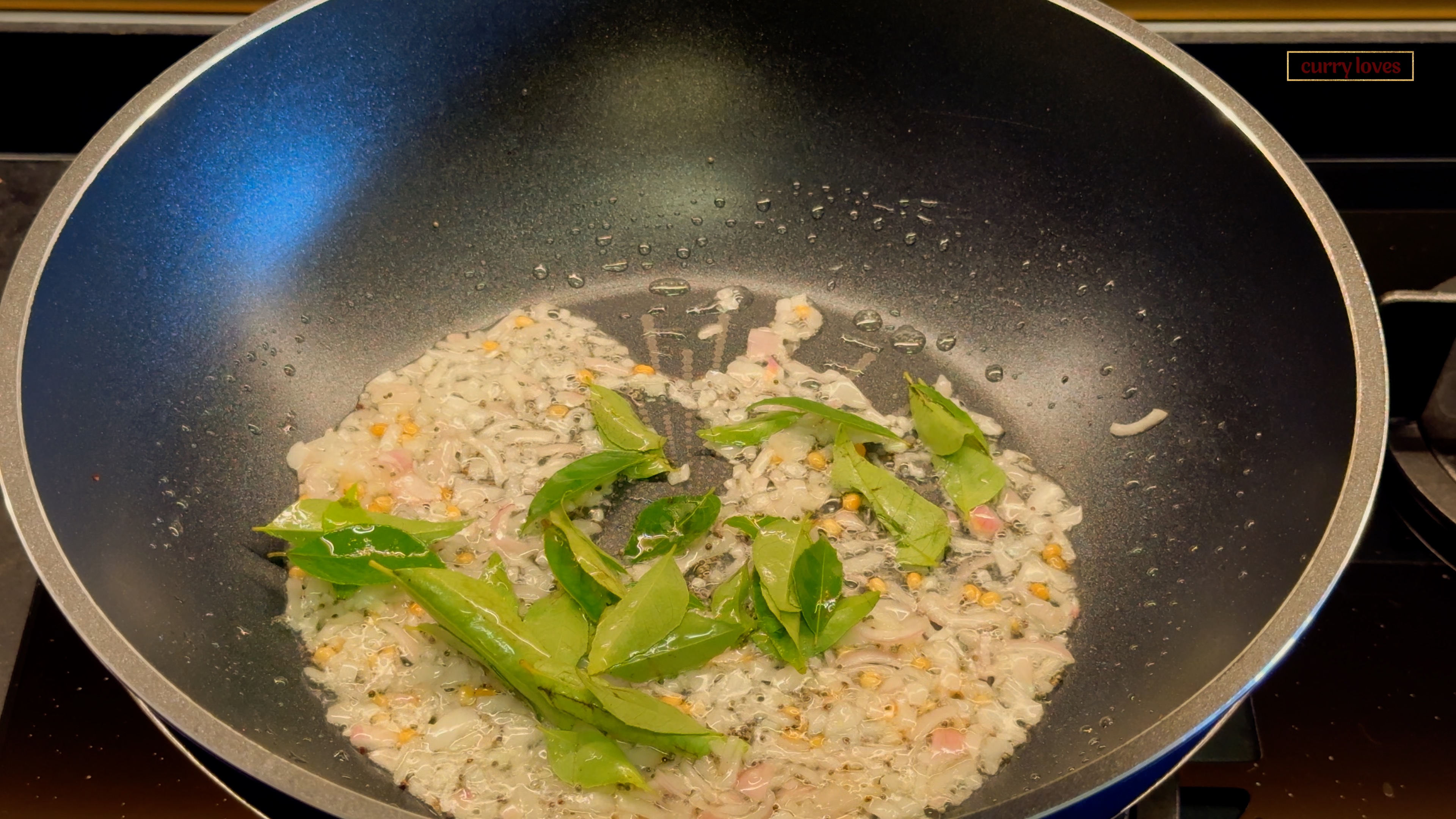 In a pan, heat the oil over medium flame. Add mustard seeds and urad dal. When they start to crackle, add the sliced onions and sauté for a few seconds. Follow this by adding curry leaves and continue to sauté for a few more seconds.