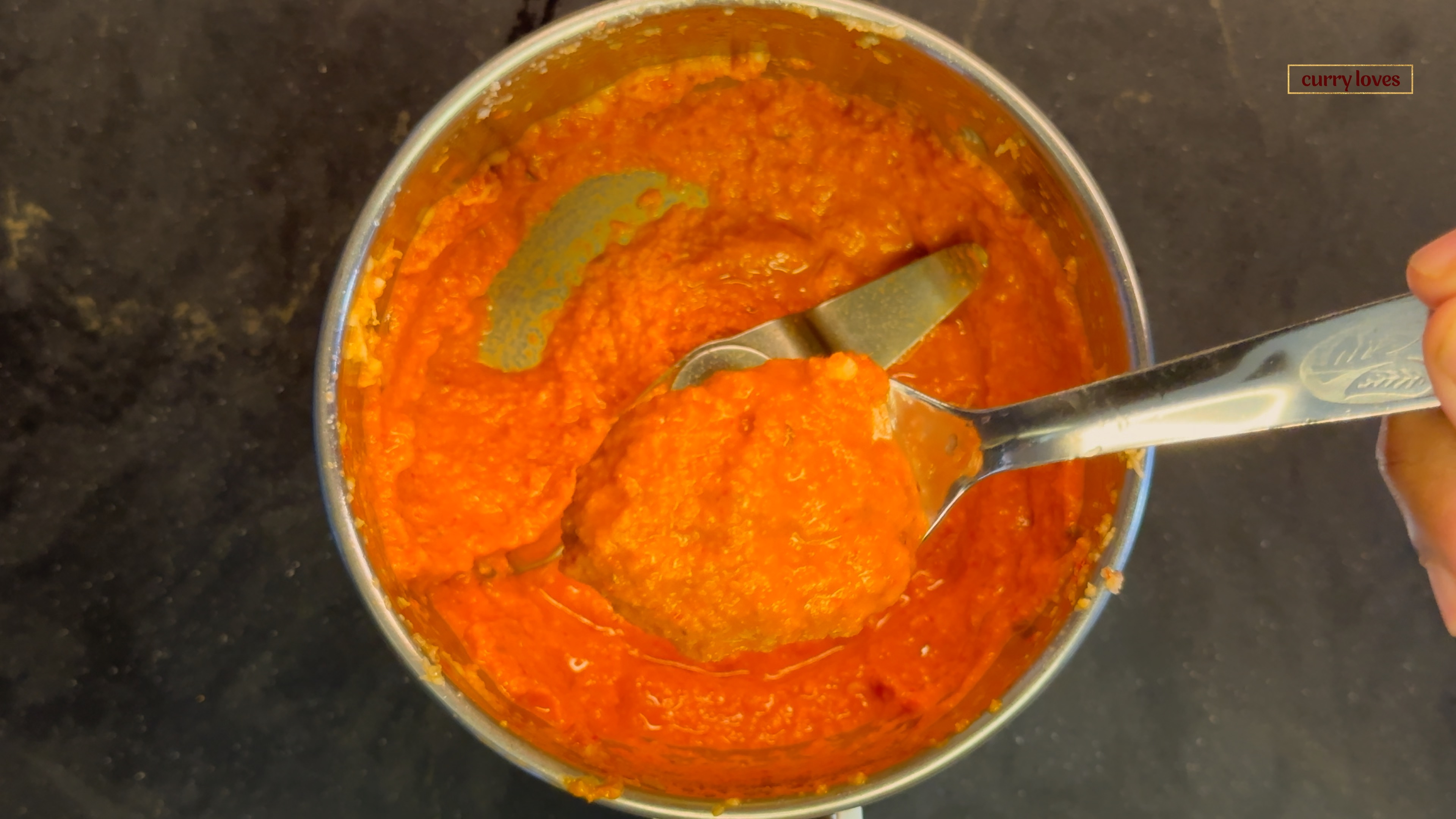 Add the ground masala paste to the pan. Reduce the flame to low and sauté for 5-6 minutes until the oil separates from the paste.