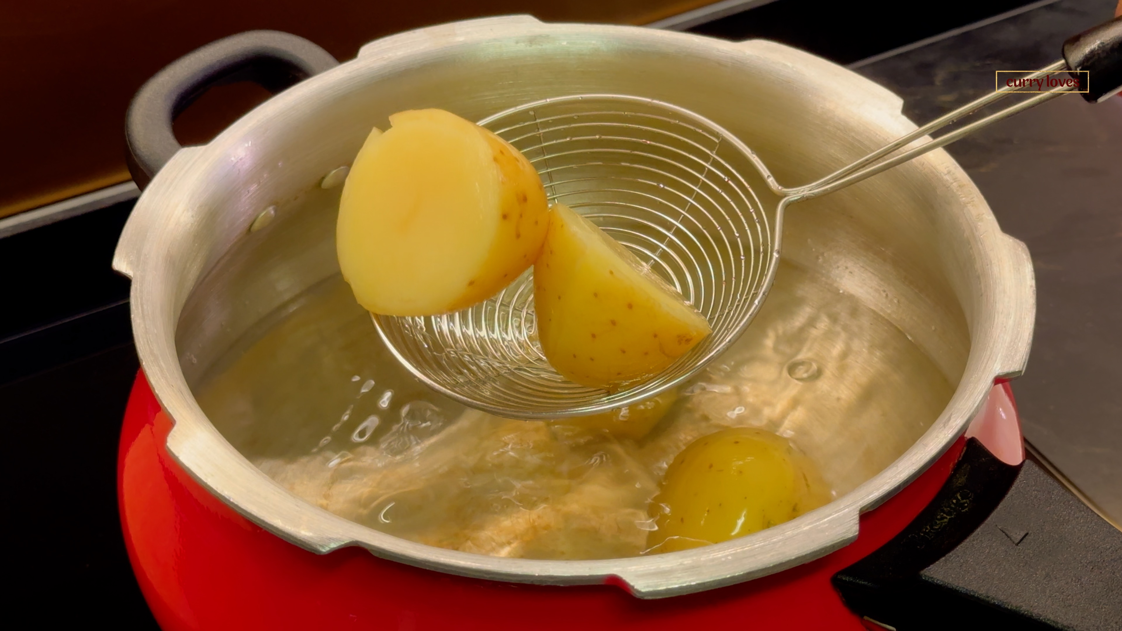 In a pressure cooker, add the medium-sized potatoes and pressure cook for 2 whistles.