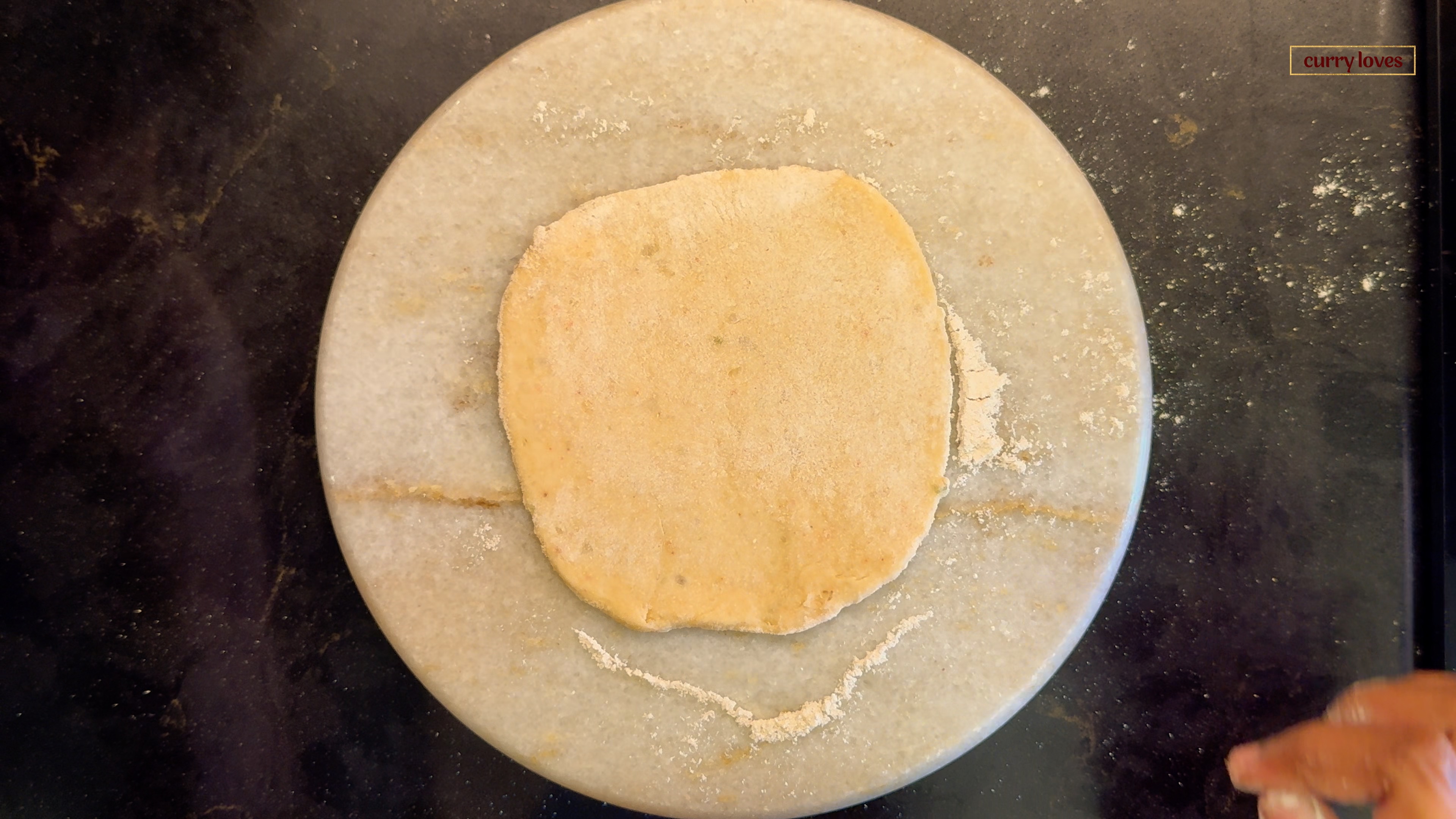 Take a small ball of dough and flatten it on a chapati board. Dust with some flour.