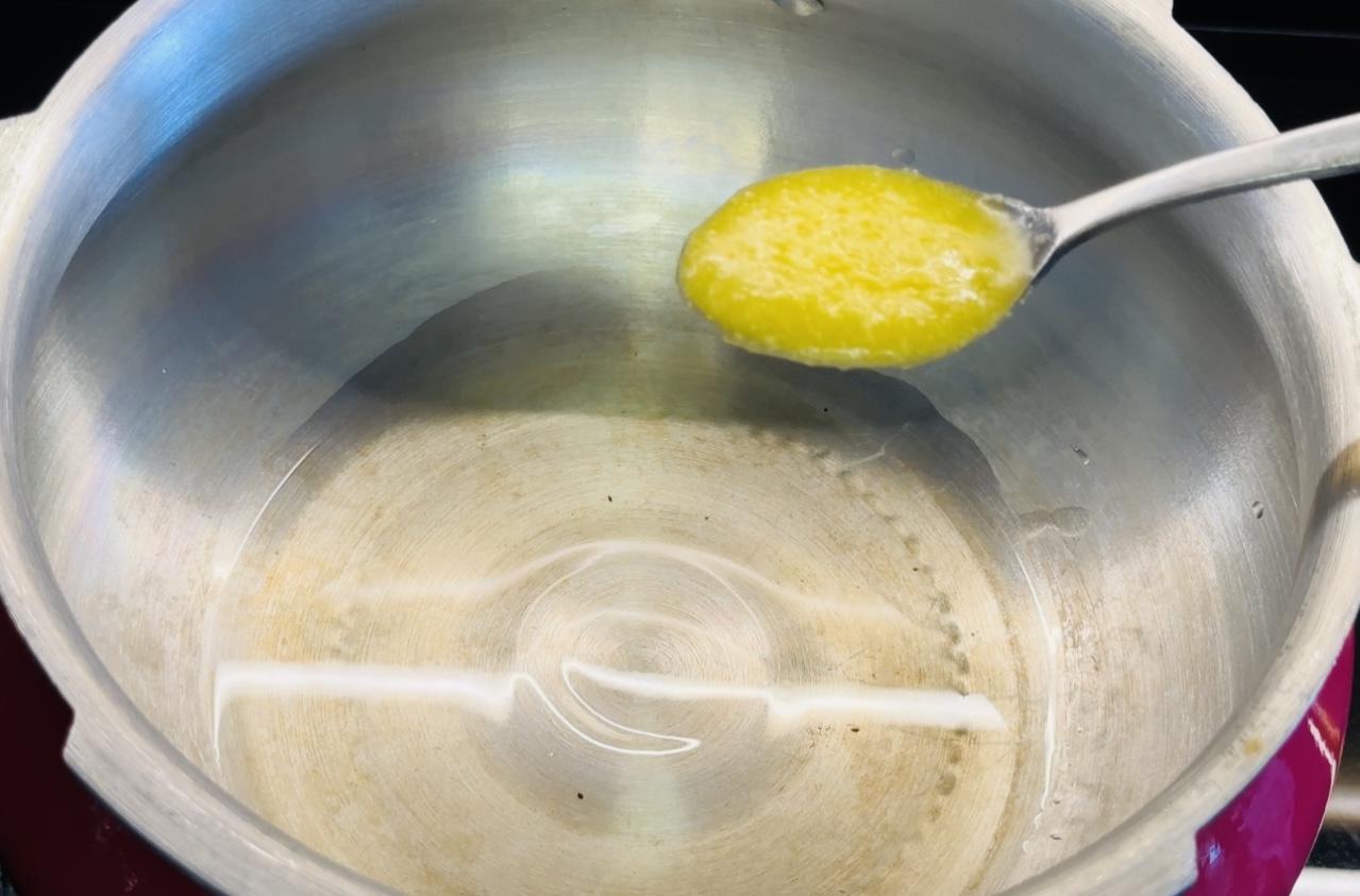 In a pressure cooker, add oil and ghee.
