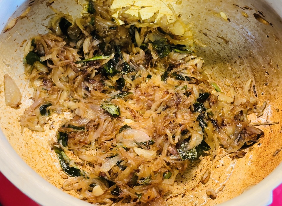 Add the sliced onions and curry leaves, and sauté until golden brown.