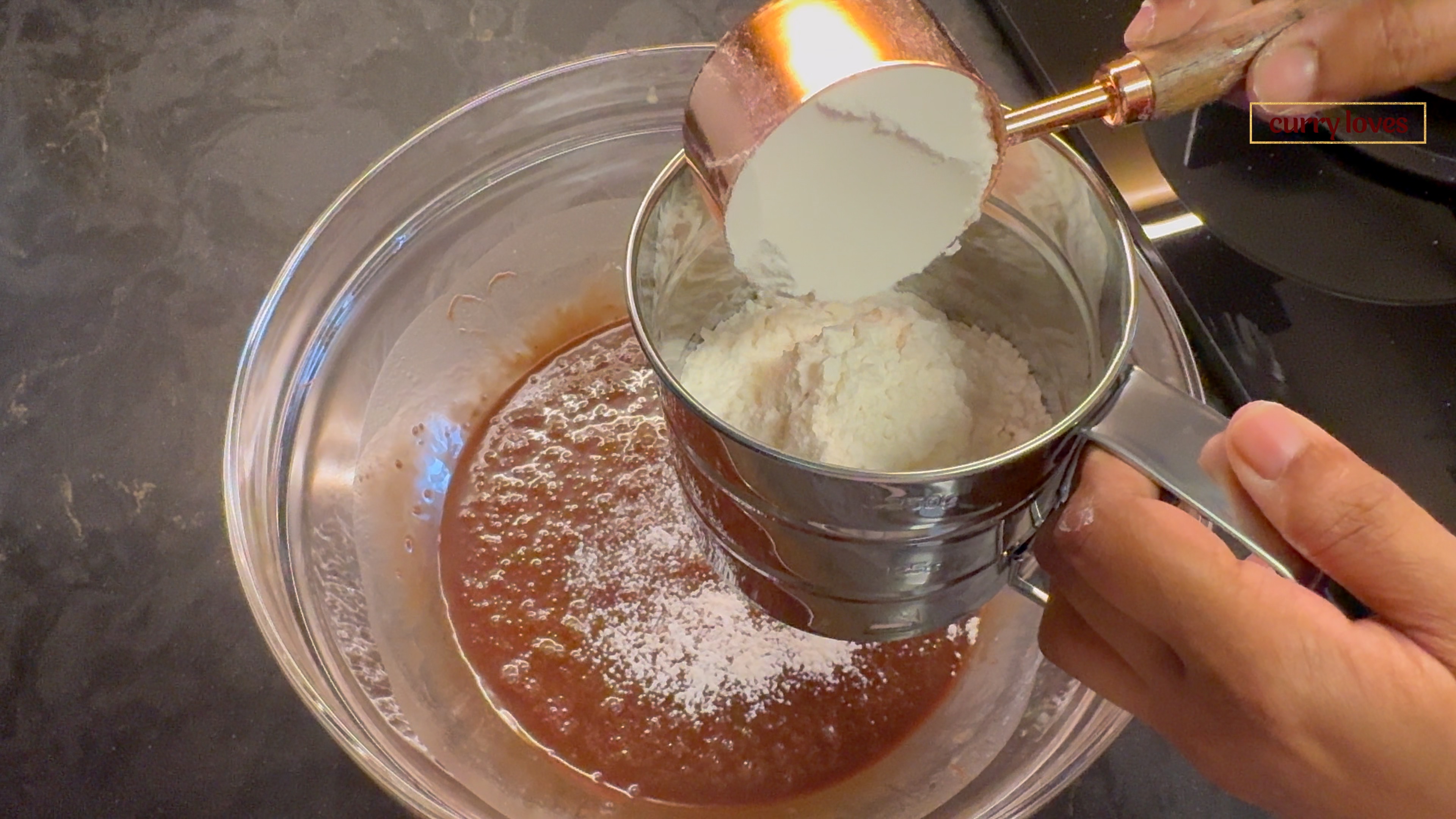 Sift together the plain flour, cocoa powder, and salt. Gently fold the dry ingredients into the wet mixture until well combined.