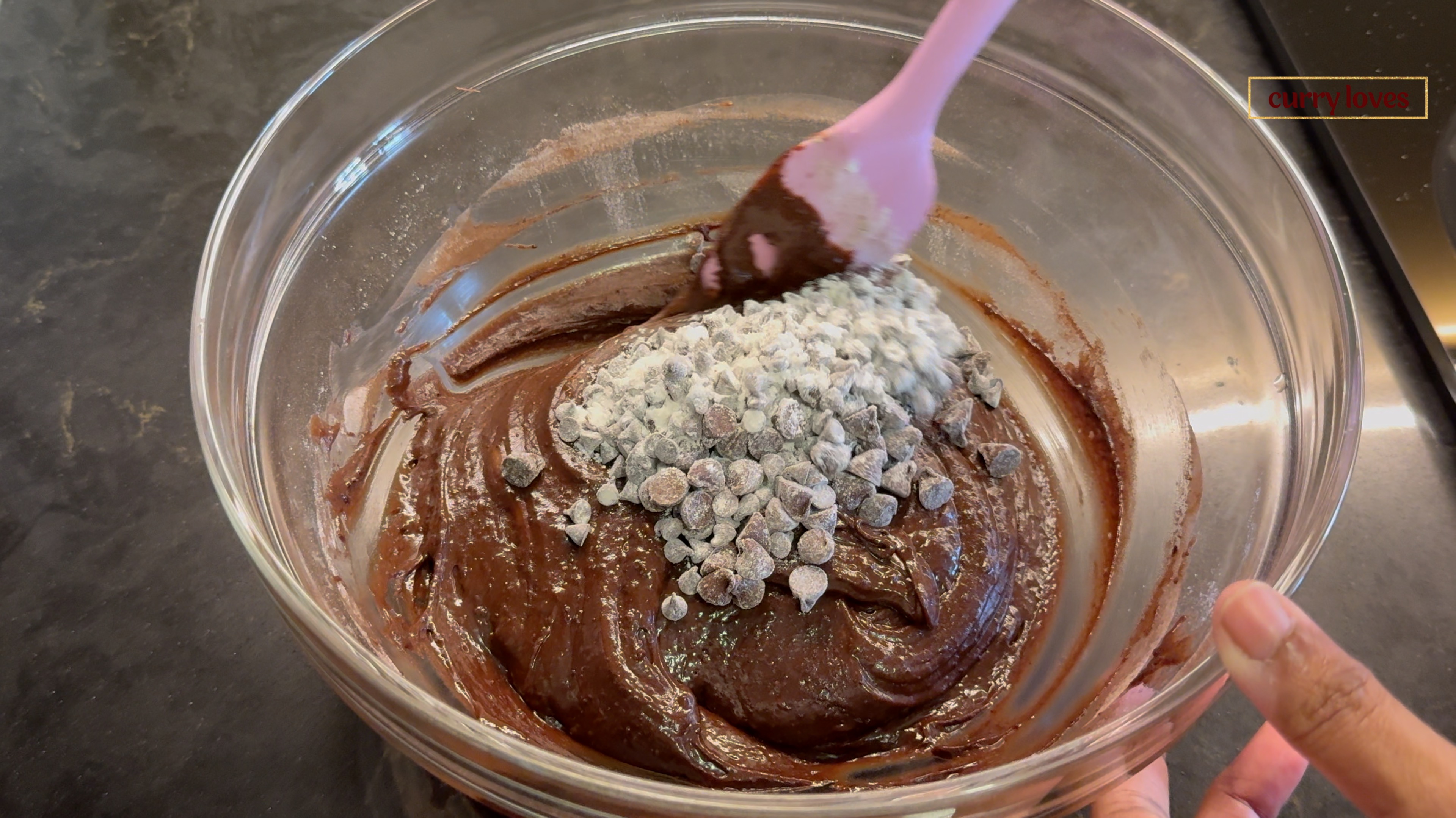 Gently fold in the chocolate chips (dusted in plain flour to prevent them from sinking to the bottom).