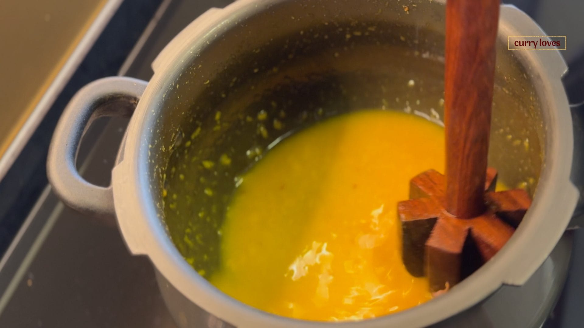 Once the steam settles, remove the weight, open the lid, and mash the dal lightly with a hand masher. Set the mashed dal aside.