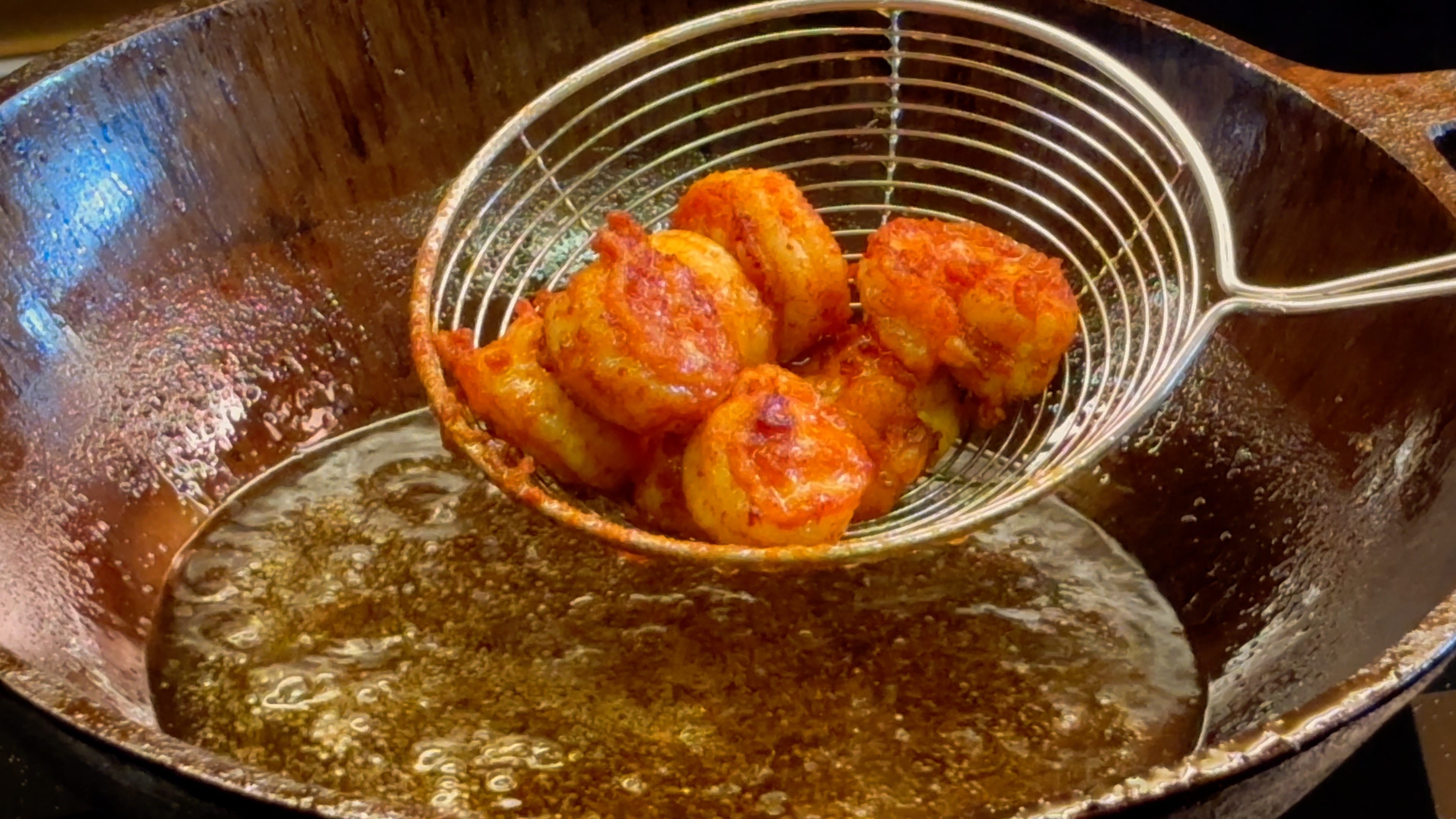Using the same oil, fry the marinated prawns in batches over medium flame for 3 minutes or until golden brown. Set aside.