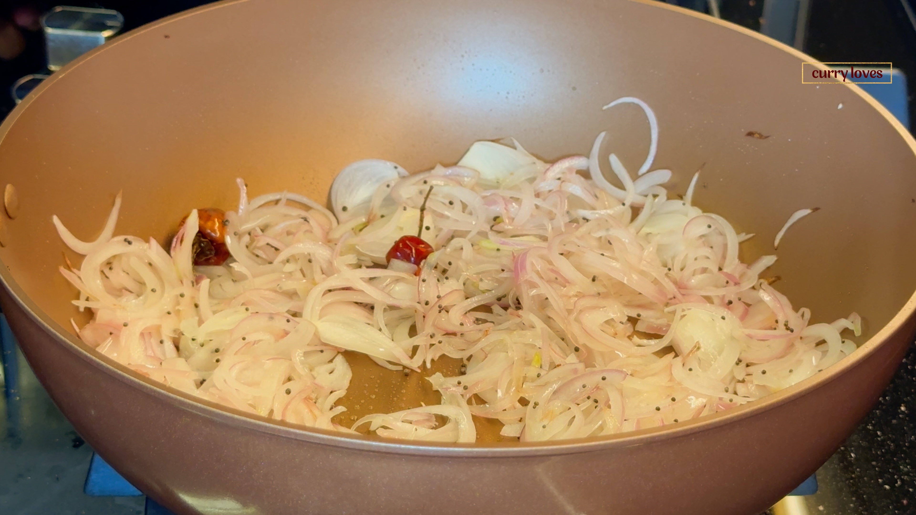 In a pan, heat the coconut oil. Once the oil is hot, add the mustard seeds and dried red chillies. After the mustard seeds crackle, add the sliced onions. Sauté the onions on medium flame for 1 minute.