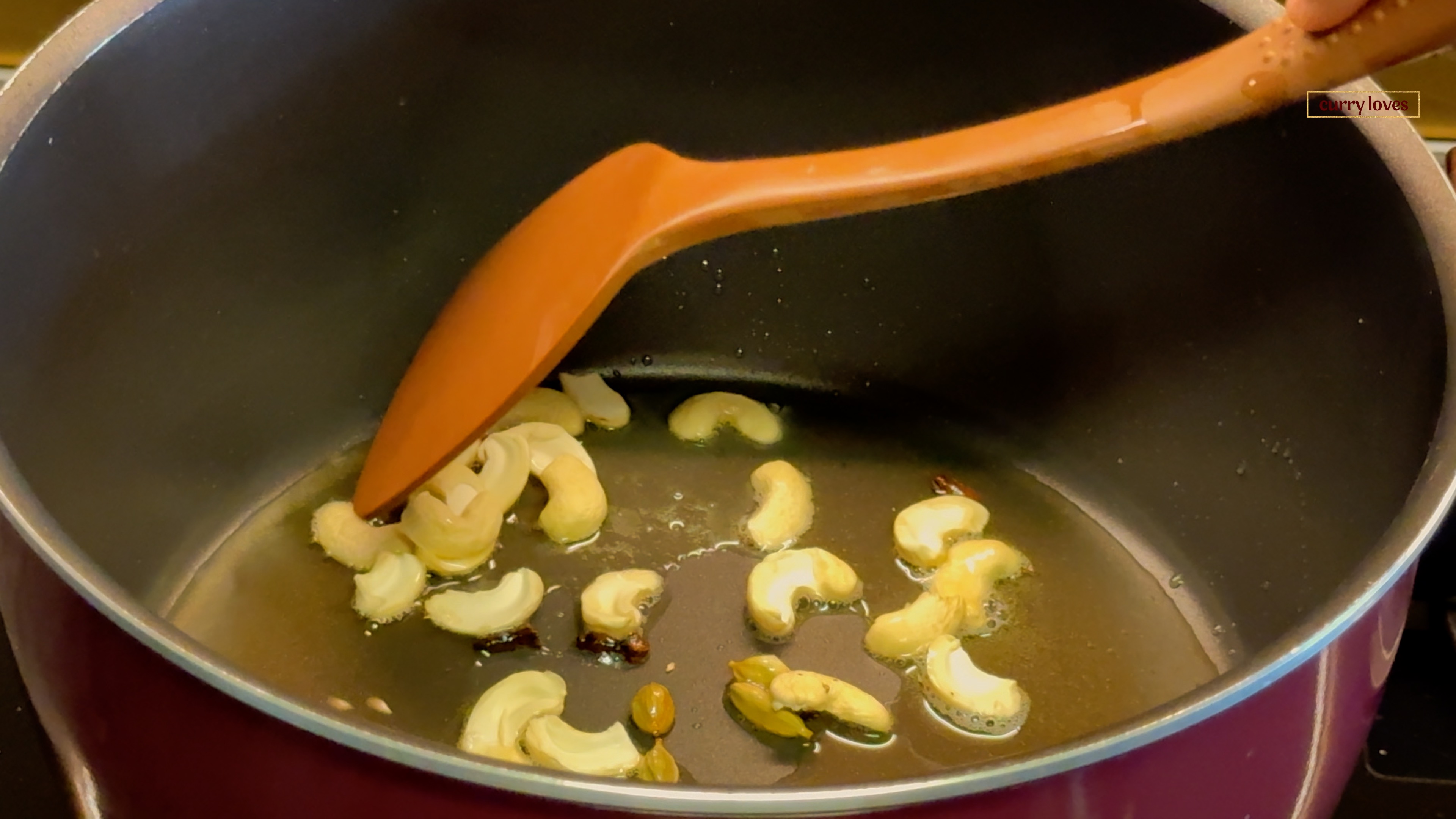 Add the cardamom, cloves, and cashew nuts. Roast for a few seconds until aromatic.