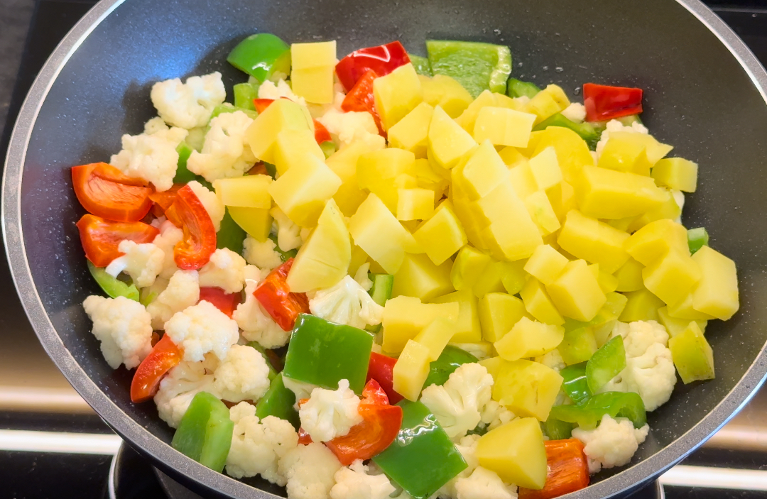 Add the capsicum and blanched cauliflower, and sauté for 2 minutes.